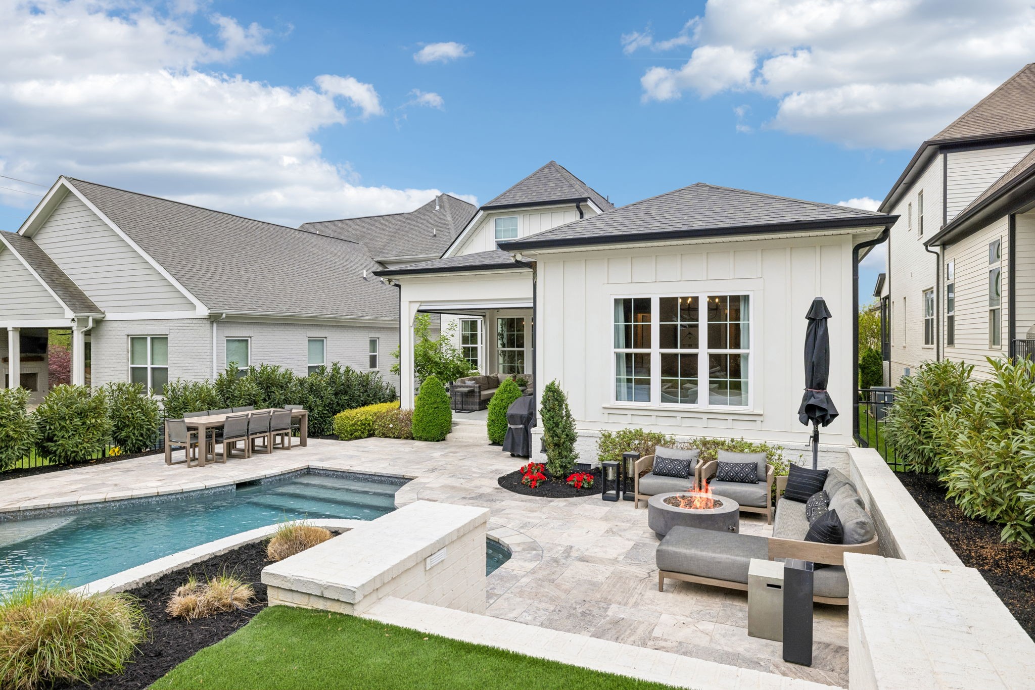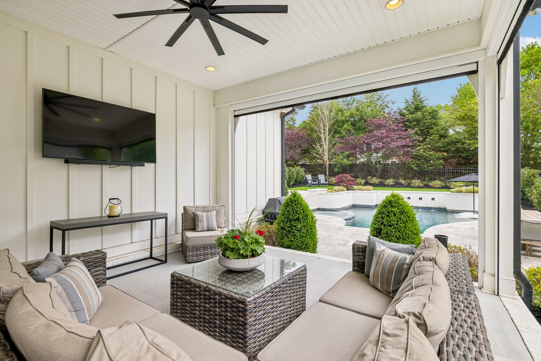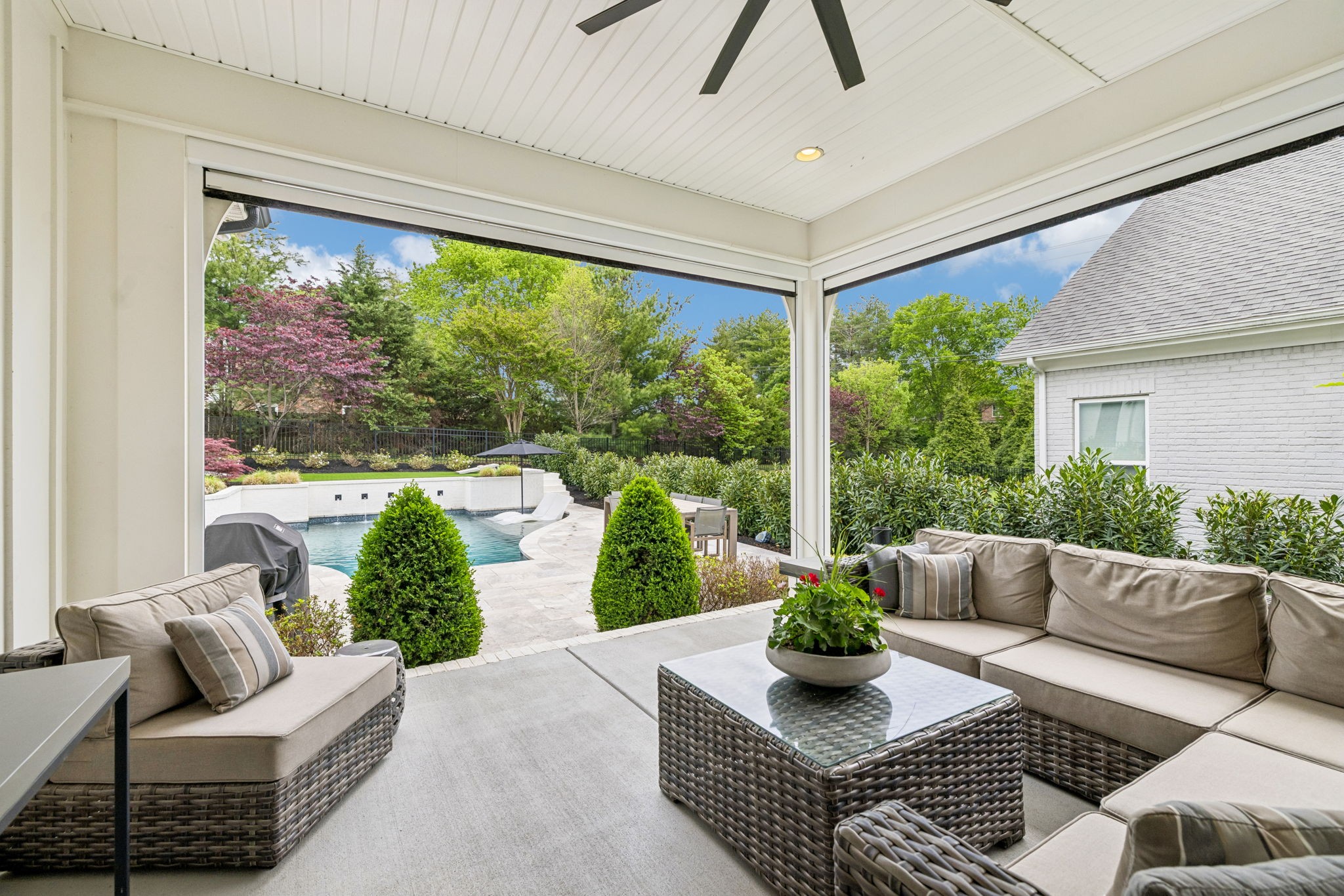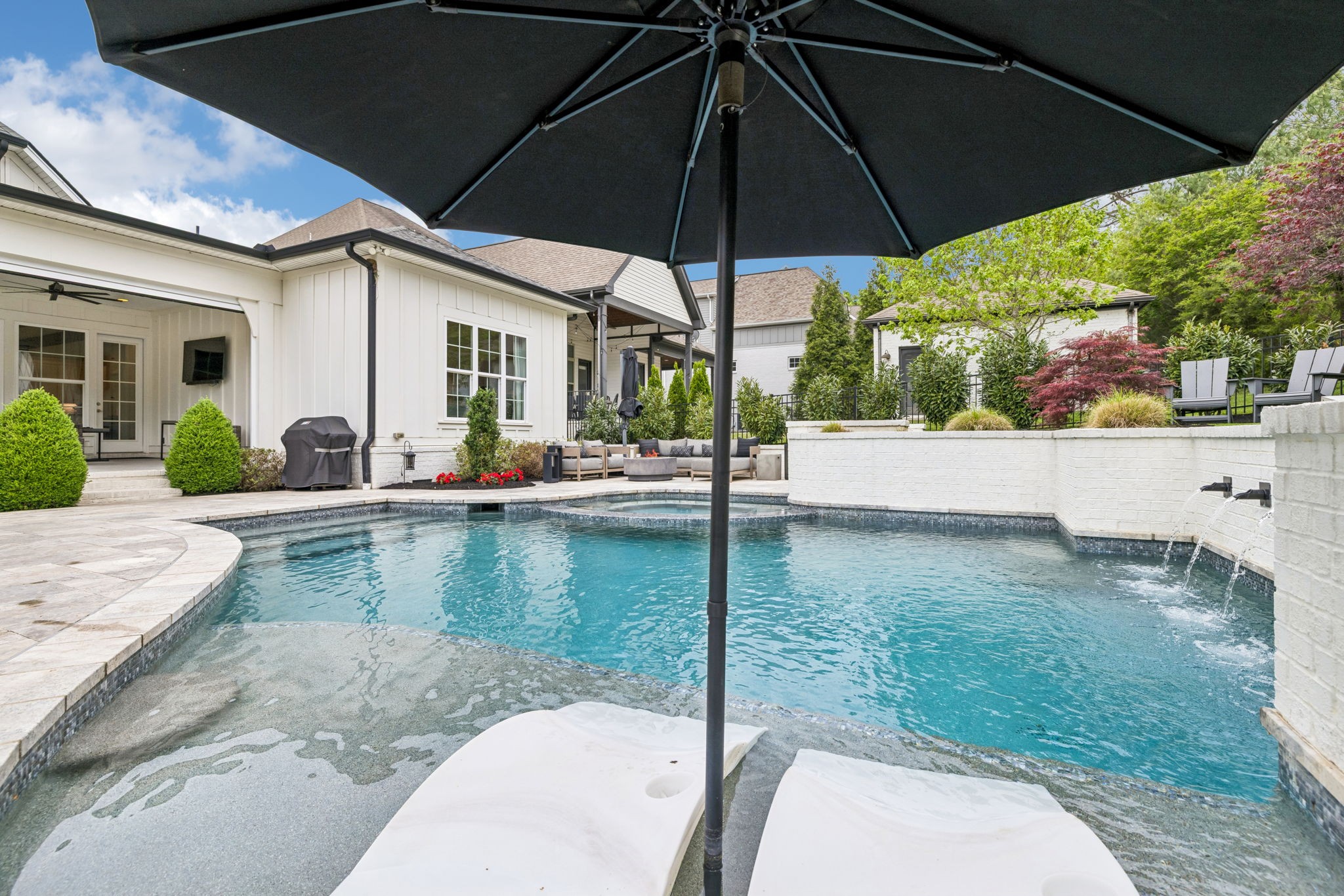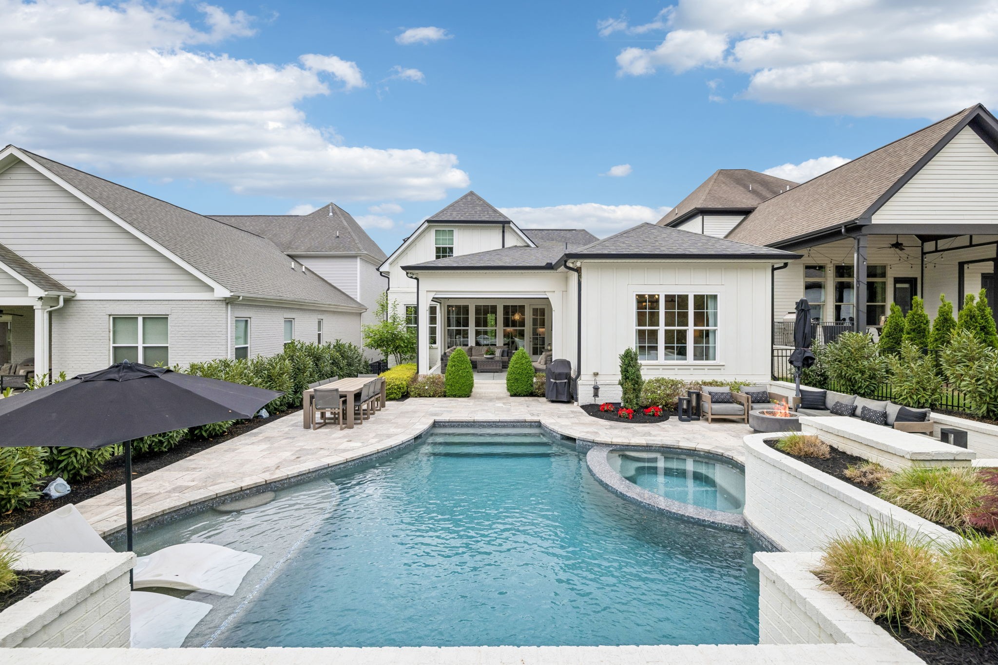 Welcome to 408 Dragonfly Court, a custom-built Hidden Valley Homes residence offering refined living just one mile from historic downtown Franklin and The Factory. Built in 2019, this 4-bedroom, 4-bath home blends thoughtful design, elevated finishes, and exceptional indoor-outdoor living. The main level features both the primary suite and guest suite, along with a functional built-in workspace seamlessly integrated into the laundry room. The chef's kitchen is designed for both everyday living and entertaining, showcasing ceiling-height custom cabinetry, a premium Cafe appliance suite, an oversized island, and a dedicated wine/cocktail area. Throughout the home, you'll find engineered hardwood flooring, upgraded tile, custom trim and shiplap, designer lighting, and Sherwin-Williams Duration paint. All closets are fully customized, and each bathroom features frameless glass shower enclosures for a clean, modern aesthetic. Step outside to a professionally designed backyard retreat featuring a saltwater Gunite pool and spa (2023), sun shelf, fire pit, and multiple gathering spaces. The covered rear porch with retractable screens by Nashville Retractable Screens, built-in gas lines, and integrated audio creates a true year-round outdoor living experience. Additional highlights include a tankless water heater, encapsulated crawlspace, extensive storage, ADT security, and premium audio/visual equipment that remains with the home. A rare opportunity to enjoy luxury, convenience, and lifestyle in one of Franklin's most desirable locations.