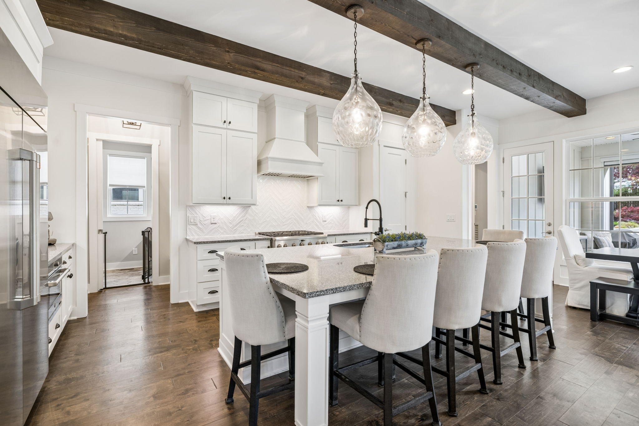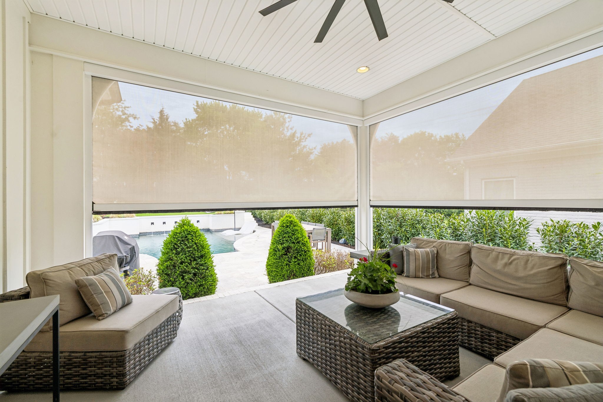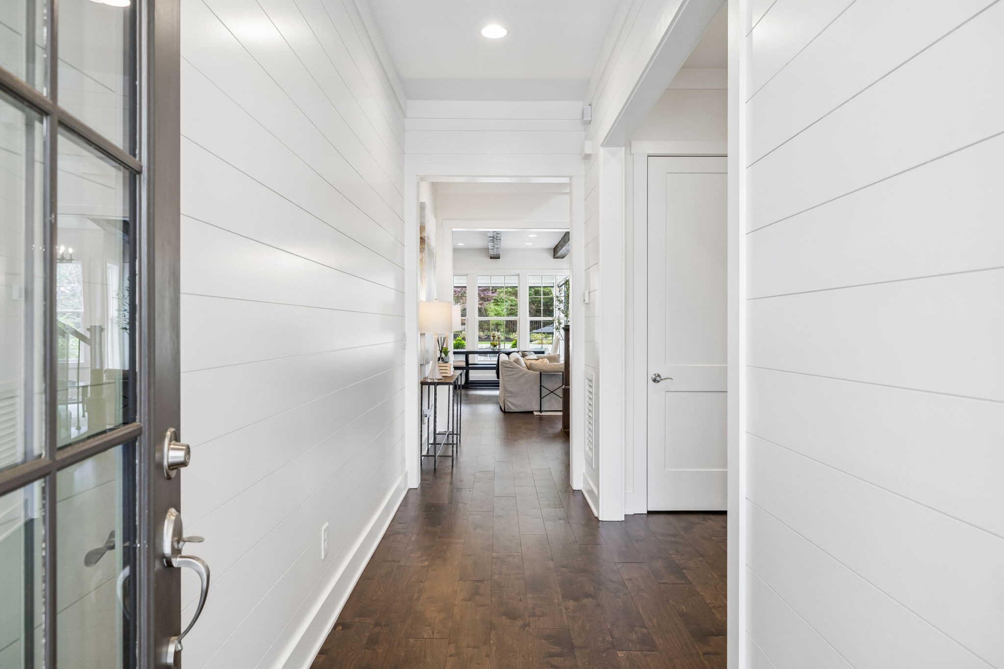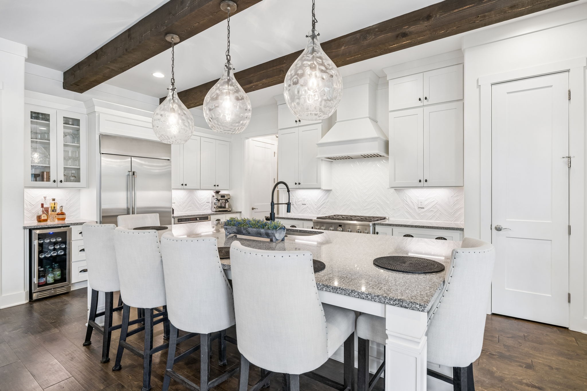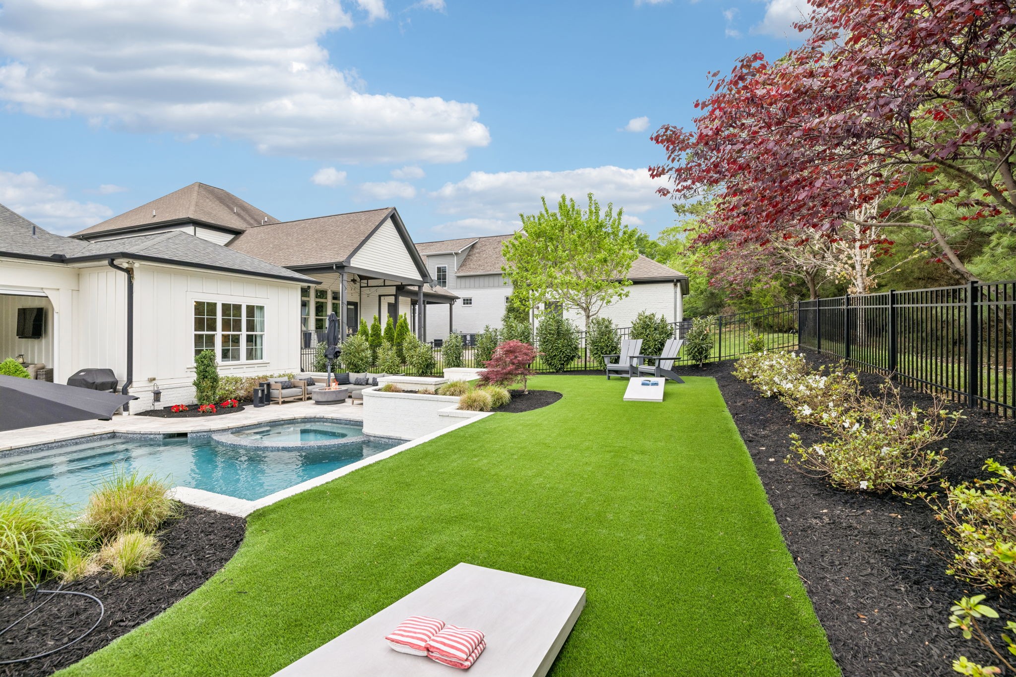 Welcome to 408 Dragonfly Court, a custom-built Hidden Valley Homes residence offering refined living just one mile from historic downtown Franklin and The Factory. Built in 2019, this 4-bedroom, 4-bath home blends thoughtful design, elevated finishes, and exceptional indoor-outdoor living. The main level features both the primary suite and guest suite, along with a functional built-in workspace seamlessly integrated into the laundry room. The chef's kitchen is designed for both everyday living and entertaining, showcasing ceiling-height custom cabinetry, a premium Cafe appliance suite, an oversized island, and a dedicated wine/cocktail area. Throughout the home, you'll find engineered hardwood flooring, upgraded tile, custom trim and shiplap, designer lighting, and Sherwin-Williams Duration paint. All closets are fully customized, and each bathroom features frameless glass shower enclosures for a clean, modern aesthetic. Step outside to a professionally designed backyard retreat featuring a saltwater Gunite pool and spa (2023), sun shelf, fire pit, and multiple gathering spaces. The covered rear porch with retractable screens by Nashville Retractable Screens, built-in gas lines, and integrated audio creates a true year-round outdoor living experience. Additional highlights include a tankless water heater, encapsulated crawlspace, extensive storage, ADT security, and premium audio/visual equipment that remains with the home. A rare opportunity to enjoy luxury, convenience, and lifestyle in one of Franklin's most desirable locations.