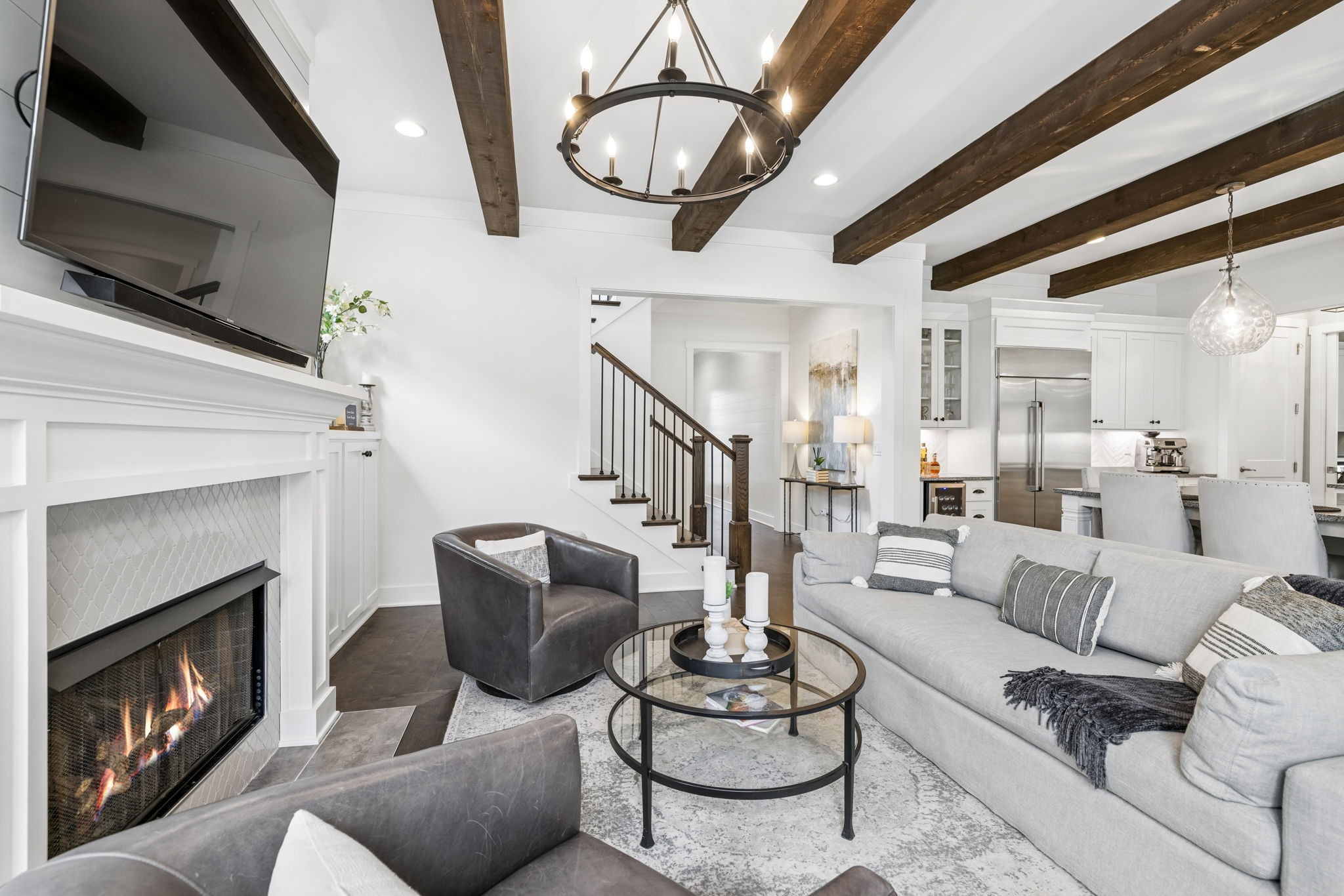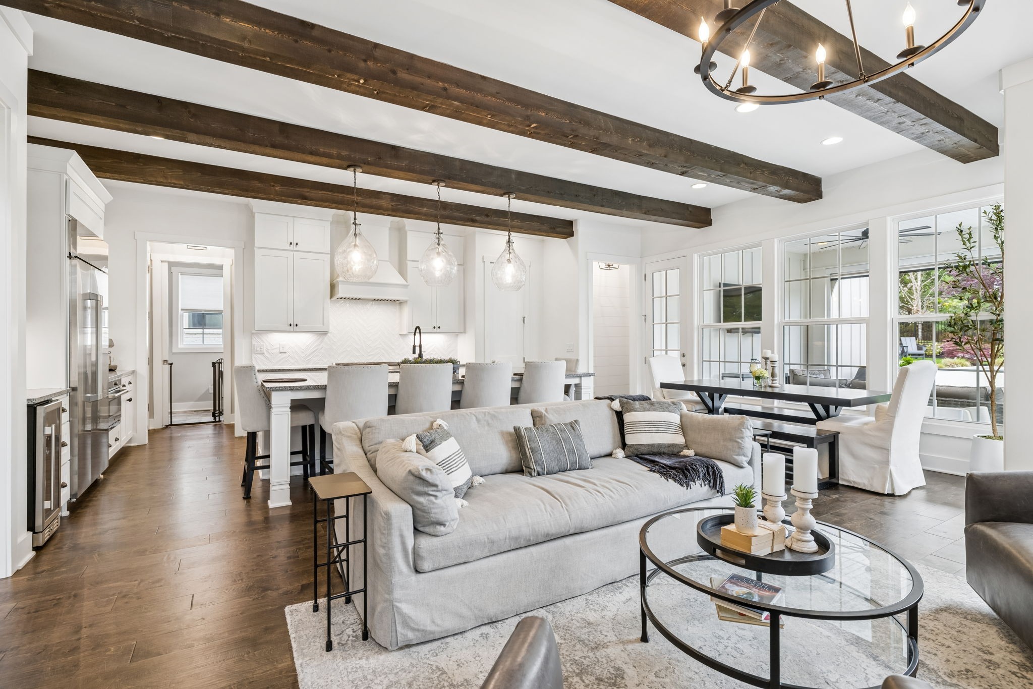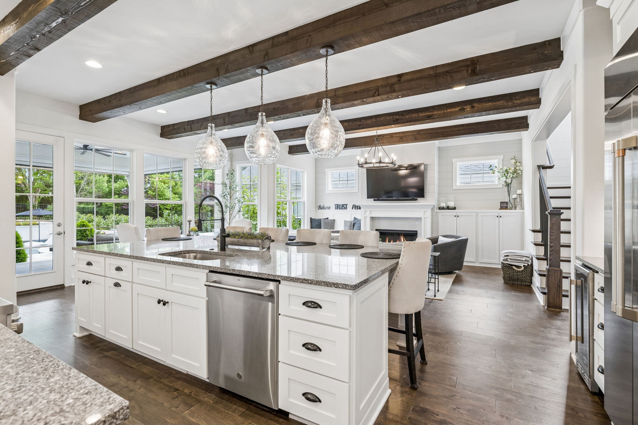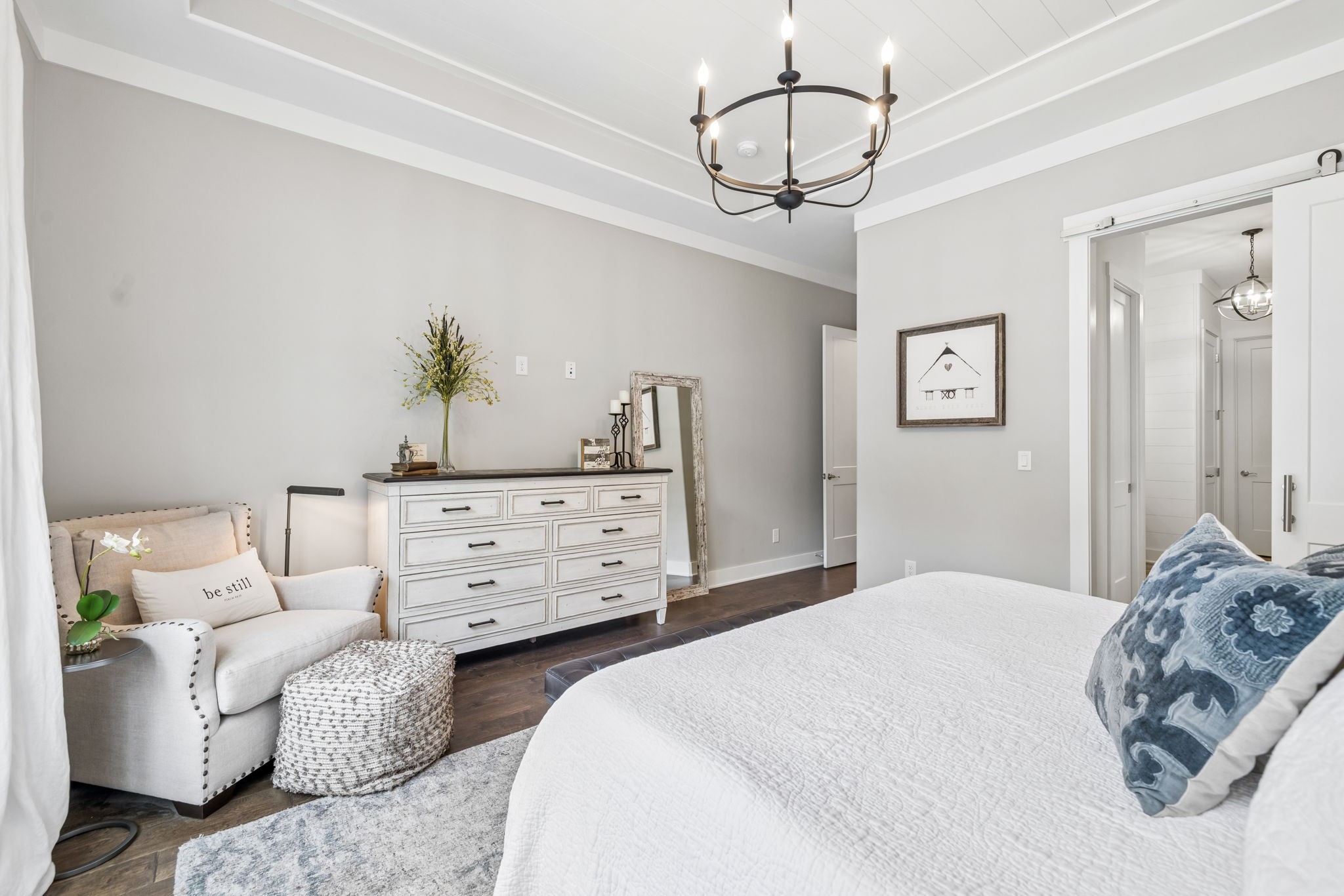 Welcome to 408 Dragonfly Court, a custom-built Hidden Valley Homes residence offering refined living just one mile from historic downtown Franklin and The Factory. Built in 2019, this 4-bedroom, 4-bath home blends thoughtful design, elevated finishes, and exceptional indoor-outdoor living. The main level features both the primary suite and guest suite, along with a functional built-in workspace seamlessly integrated into the laundry room. The chef's kitchen is designed for both everyday living and entertaining, showcasing ceiling-height custom cabinetry, a premium Cafe appliance suite, an oversized island, and a dedicated wine/cocktail area. Throughout the home, you'll find engineered hardwood flooring, upgraded tile, custom trim and shiplap, designer lighting, and Sherwin-Williams Duration paint. All closets are fully customized, and each bathroom features frameless glass shower enclosures for a clean, modern aesthetic. Step outside to a professionally designed backyard retreat featuring a saltwater Gunite pool and spa (2023), sun shelf, fire pit, and multiple gathering spaces. The covered rear porch with retractable screens by Nashville Retractable Screens, built-in gas lines, and integrated audio creates a true year-round outdoor living experience. Additional highlights include a tankless water heater, encapsulated crawlspace, extensive storage, ADT security, and premium audio/visual equipment that remains with the home. A rare opportunity to enjoy luxury, convenience, and lifestyle in one of Franklin's most desirable locations.