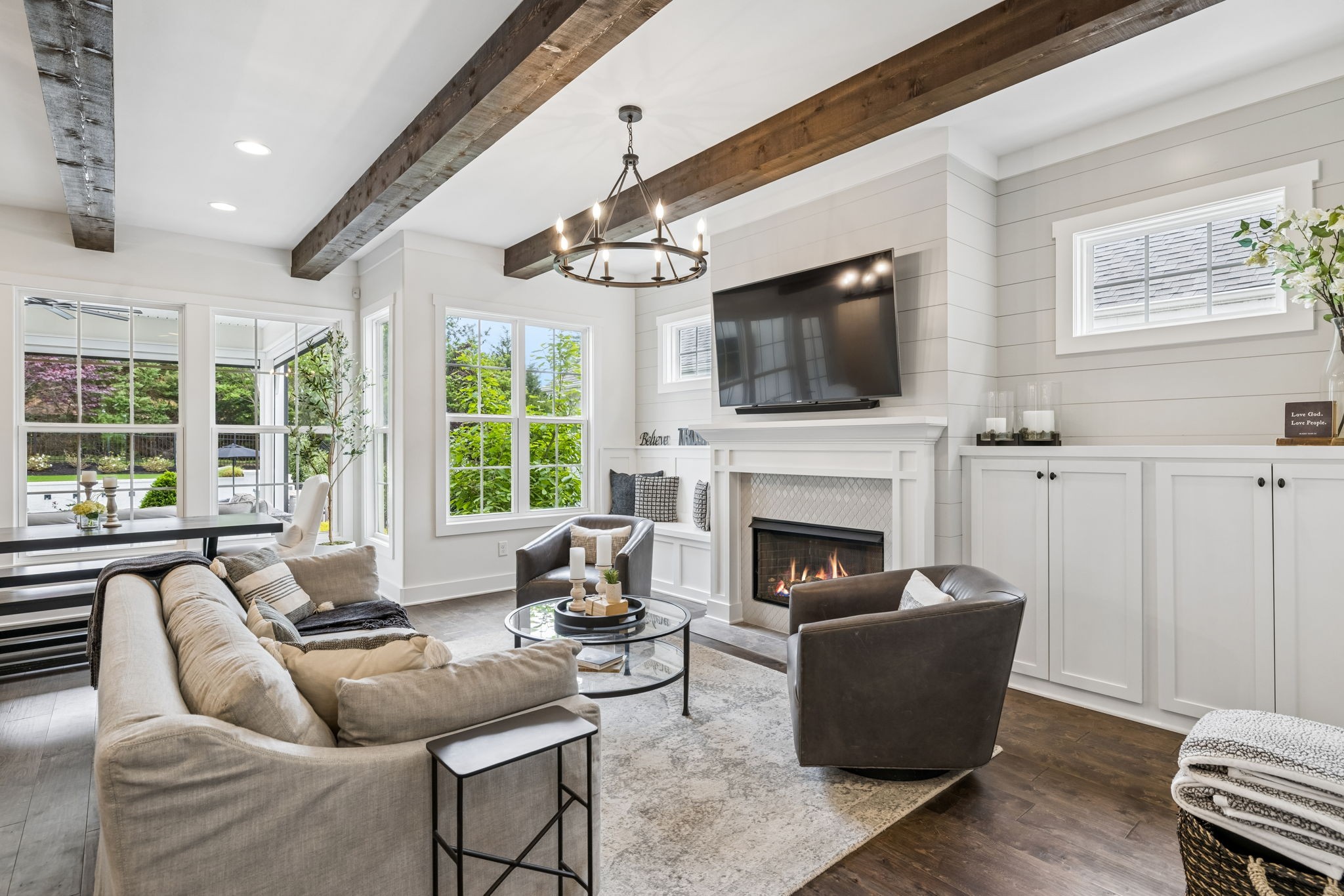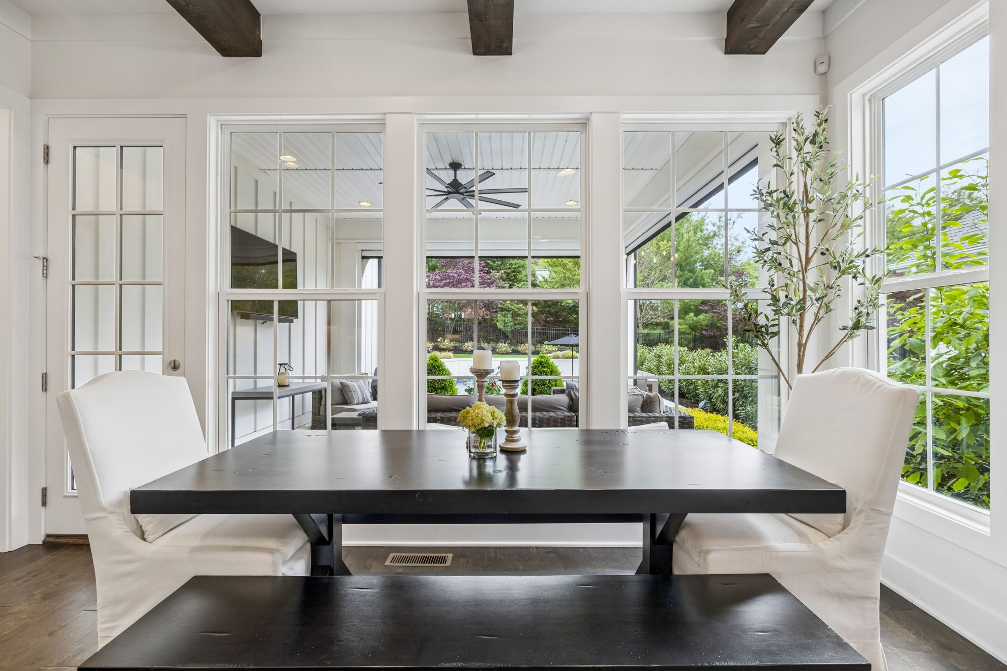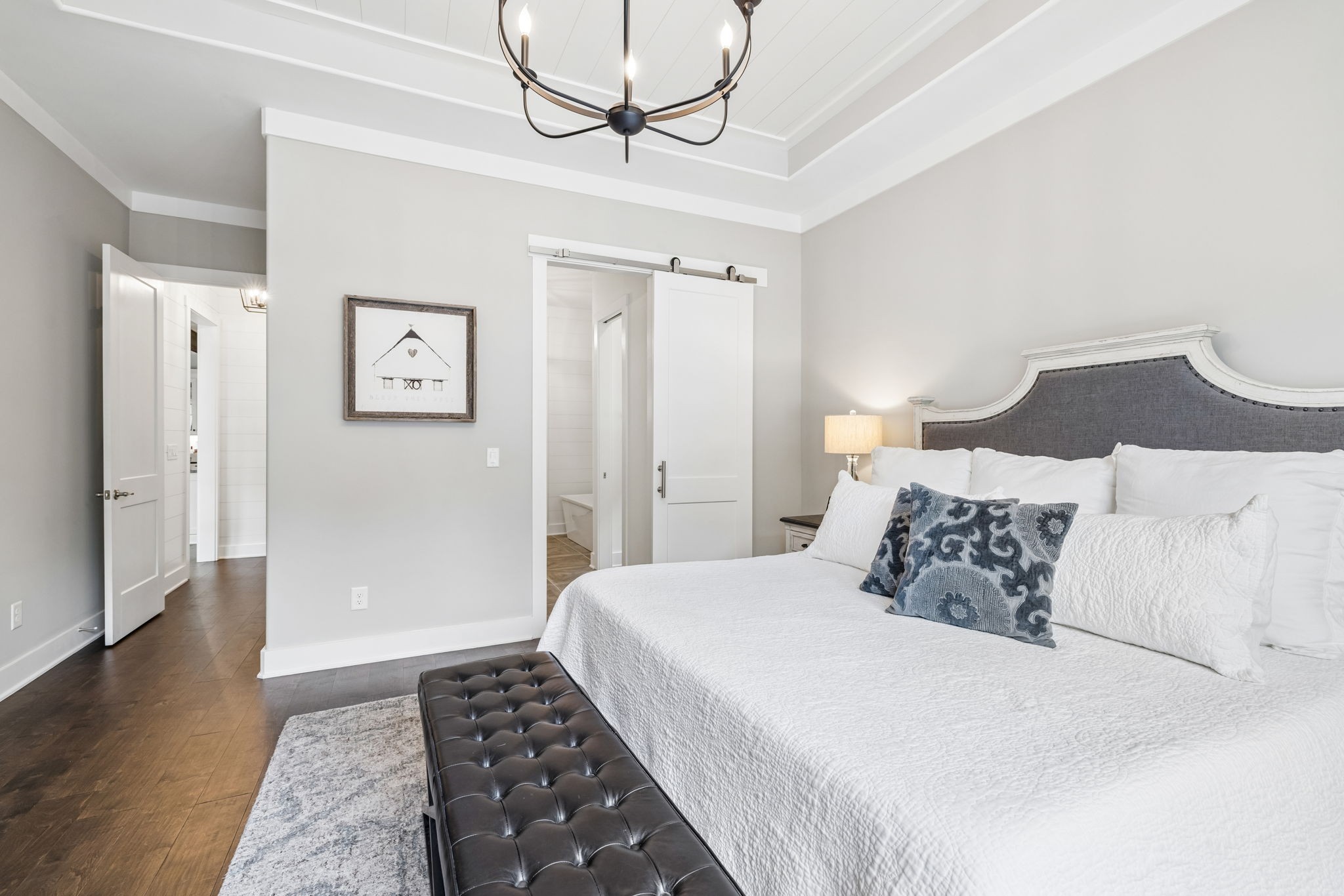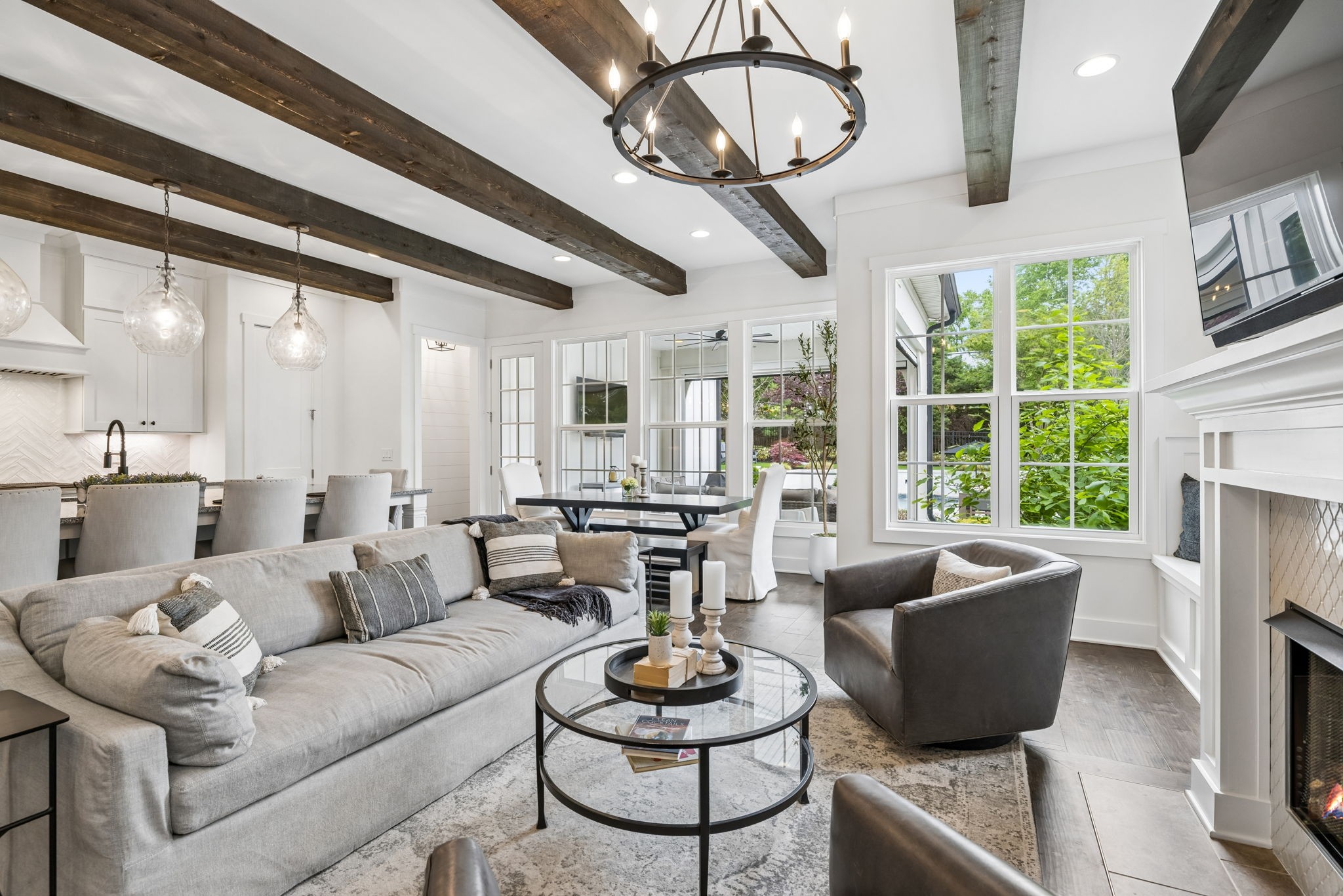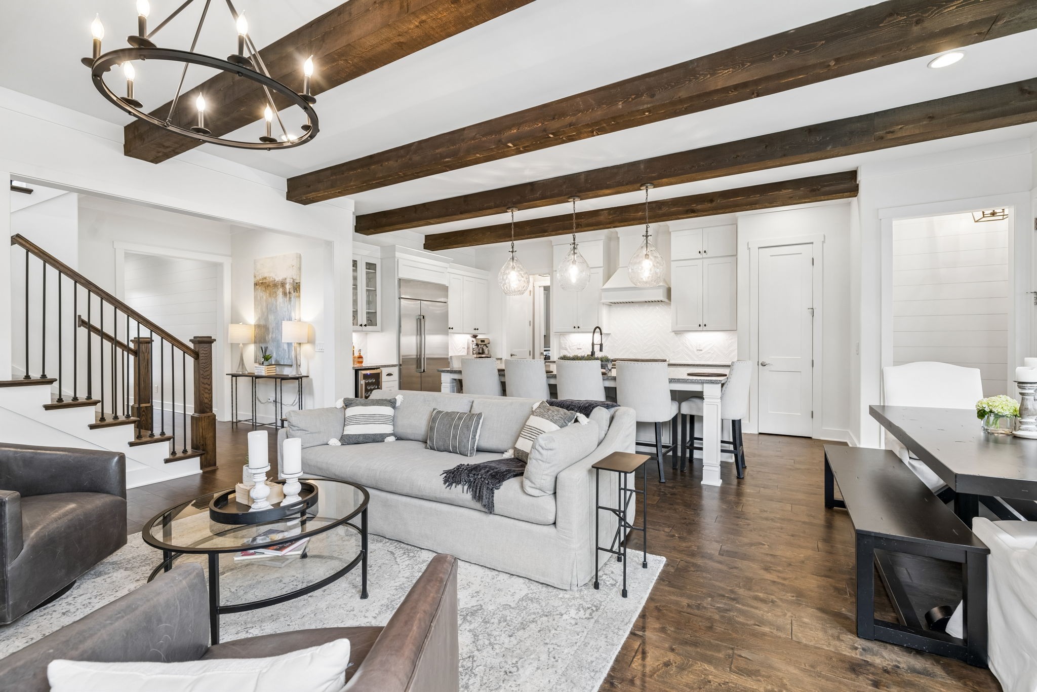 Welcome to 408 Dragonfly Court, a custom-built Hidden Valley Homes residence offering refined living just one mile from historic downtown Franklin and The Factory. Built in 2019, this 4-bedroom, 4-bath home blends thoughtful design, elevated finishes, and exceptional indoor-outdoor living. The main level features both the primary suite and guest suite, along with a functional built-in workspace seamlessly integrated into the laundry room. The chef's kitchen is designed for both everyday living and entertaining, showcasing ceiling-height custom cabinetry, a premium Cafe appliance suite, an oversized island, and a dedicated wine/cocktail area. Throughout the home, you'll find engineered hardwood flooring, upgraded tile, custom trim and shiplap, designer lighting, and Sherwin-Williams Duration paint. All closets are fully customized, and each bathroom features frameless glass shower enclosures for a clean, modern aesthetic. Step outside to a professionally designed backyard retreat featuring a saltwater Gunite pool and spa (2023), sun shelf, fire pit, and multiple gathering spaces. The covered rear porch with retractable screens by Nashville Retractable Screens, built-in gas lines, and integrated audio creates a true year-round outdoor living experience. Additional highlights include a tankless water heater, encapsulated crawlspace, extensive storage, ADT security, and premium audio/visual equipment that remains with the home. A rare opportunity to enjoy luxury, convenience, and lifestyle in one of Franklin's most desirable locations.