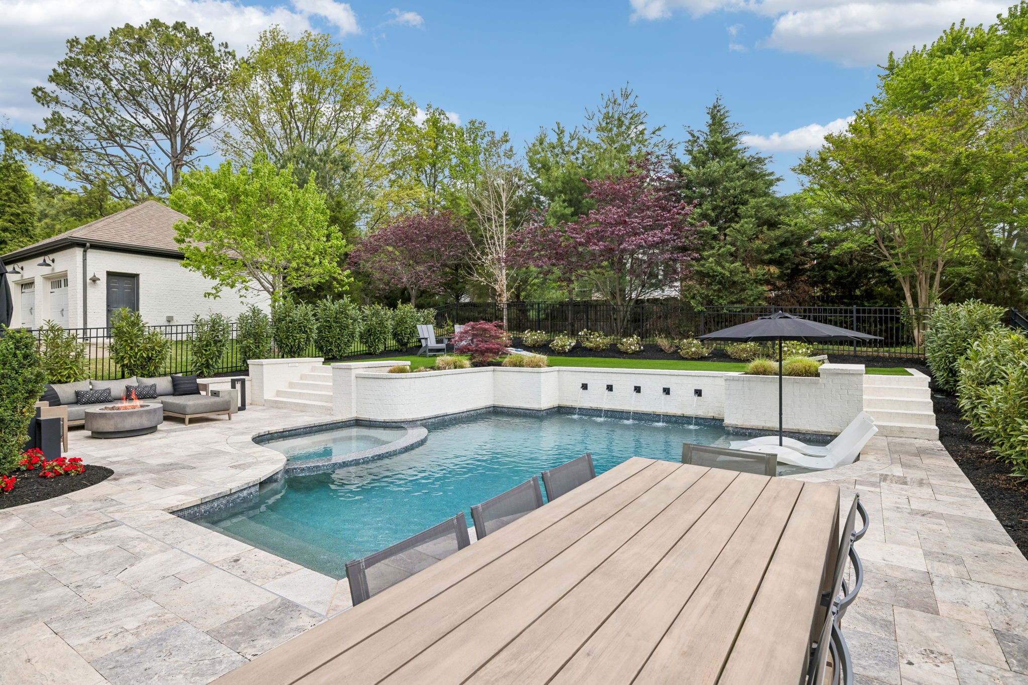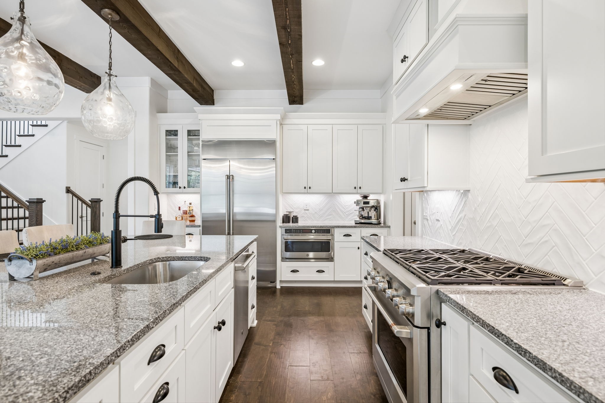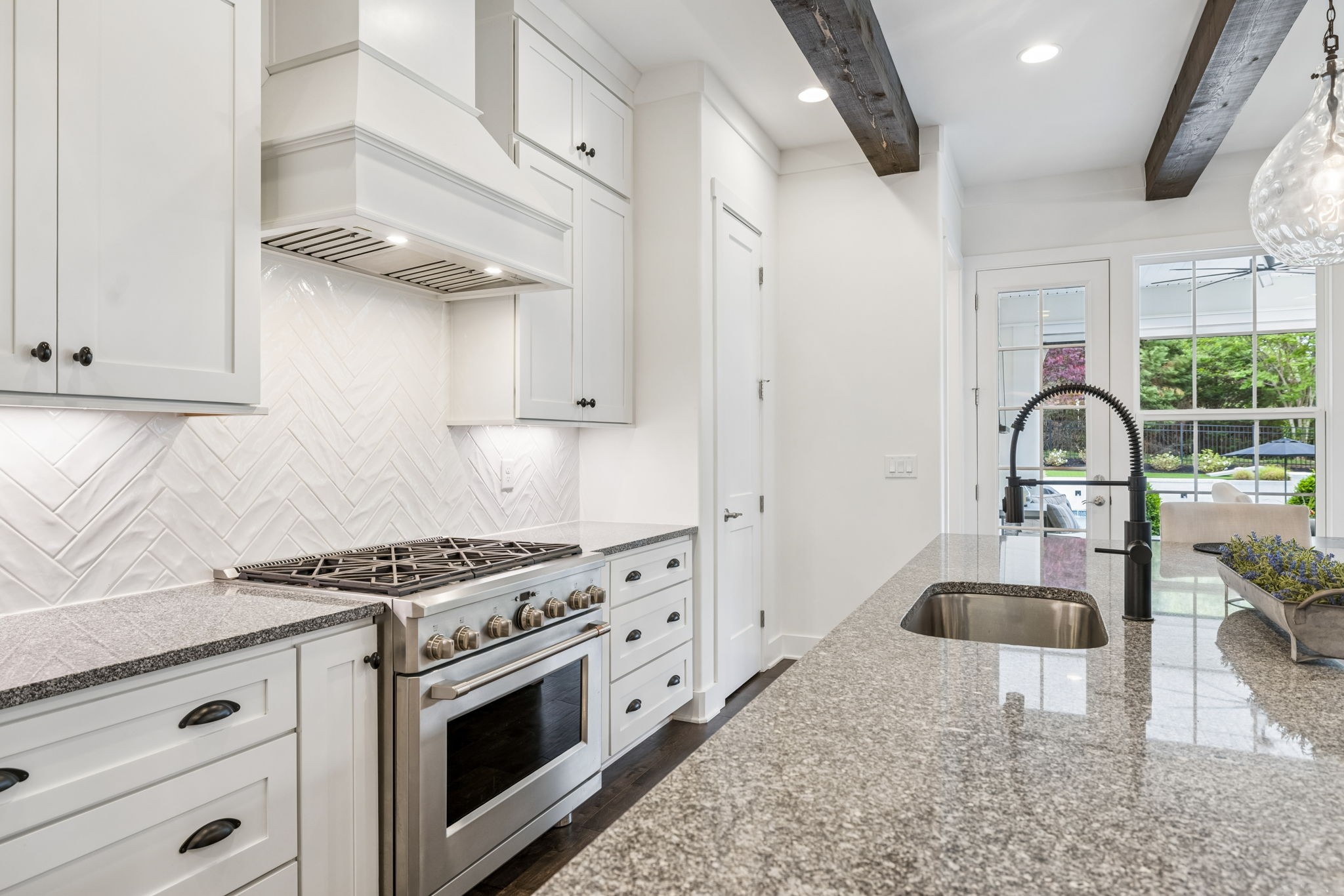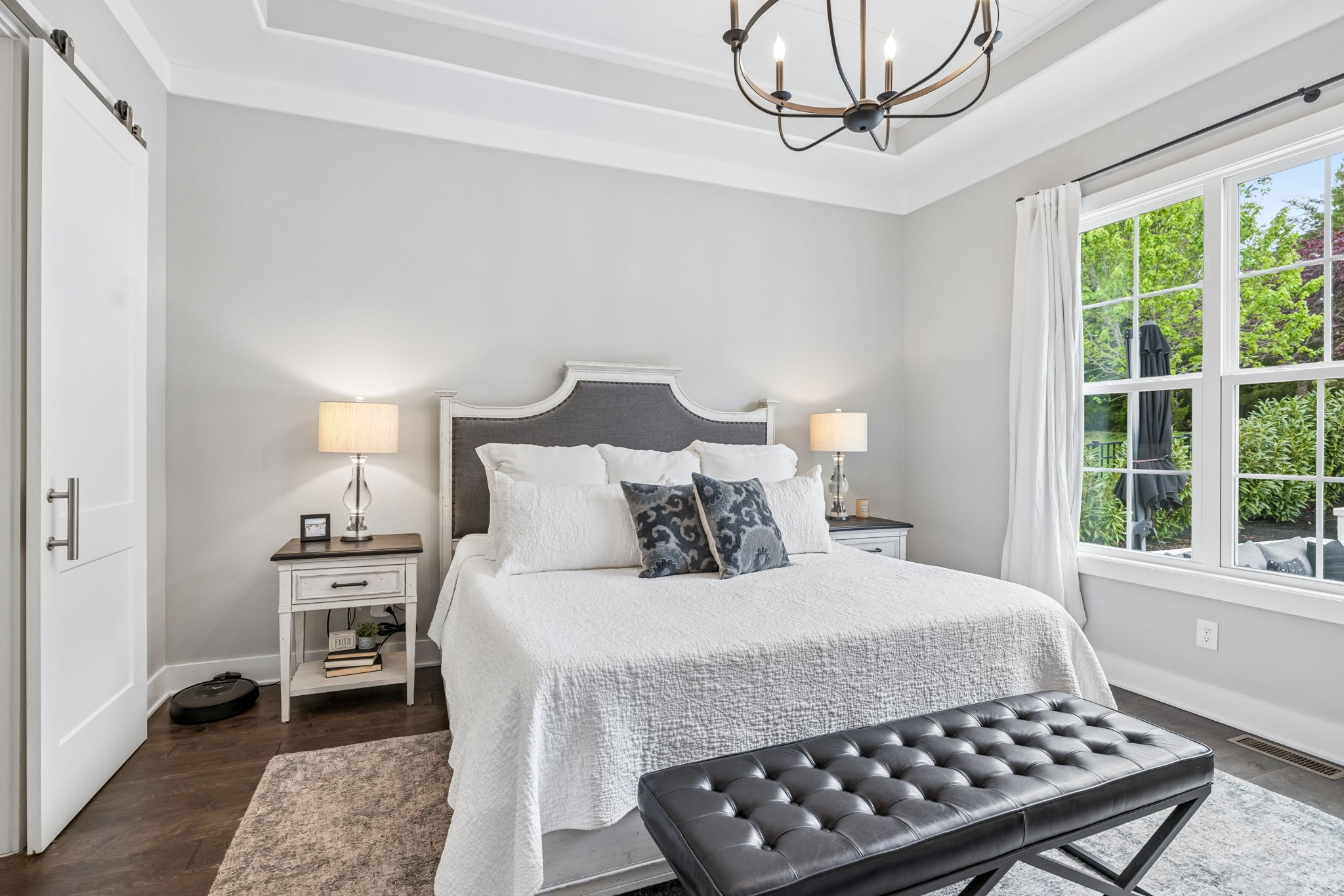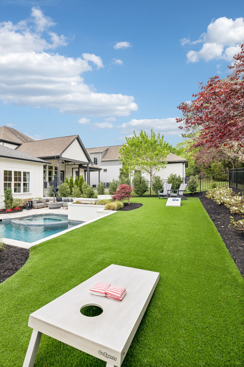 Welcome to 408 Dragonfly Court, a custom-built Hidden Valley Homes residence offering refined living just one mile from historic downtown Franklin and The Factory. Built in 2019, this 4-bedroom, 4-bath home blends thoughtful design, elevated finishes, and exceptional indoor-outdoor living. The main level features both the primary suite and guest suite, along with a functional built-in workspace seamlessly integrated into the laundry room. The chef's kitchen is designed for both everyday living and entertaining, showcasing ceiling-height custom cabinetry, a premium Cafe appliance suite, an oversized island, and a dedicated wine/cocktail area. Throughout the home, you'll find engineered hardwood flooring, upgraded tile, custom trim and shiplap, designer lighting, and Sherwin-Williams Duration paint. All closets are fully customized, and each bathroom features frameless glass shower enclosures for a clean, modern aesthetic. Step outside to a professionally designed backyard retreat featuring a saltwater Gunite pool and spa (2023), sun shelf, fire pit, and multiple gathering spaces. The covered rear porch with retractable screens by Nashville Retractable Screens, built-in gas lines, and integrated audio creates a true year-round outdoor living experience. Additional highlights include a tankless water heater, encapsulated crawlspace, extensive storage, ADT security, and premium audio/visual equipment that remains with the home. A rare opportunity to enjoy luxury, convenience, and lifestyle in one of Franklin's most desirable locations.