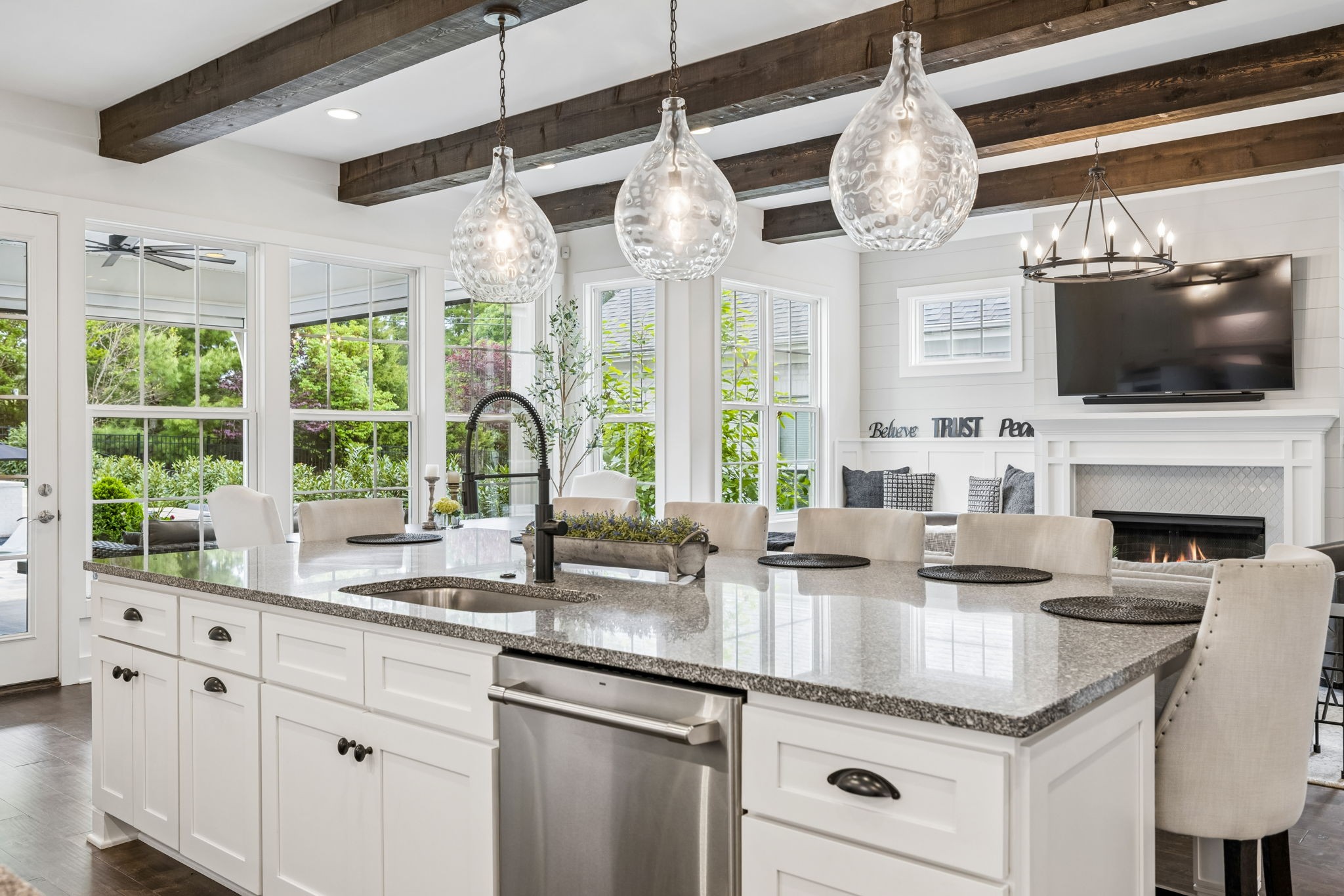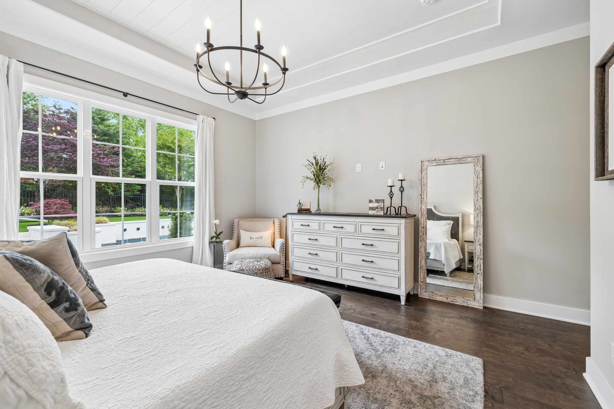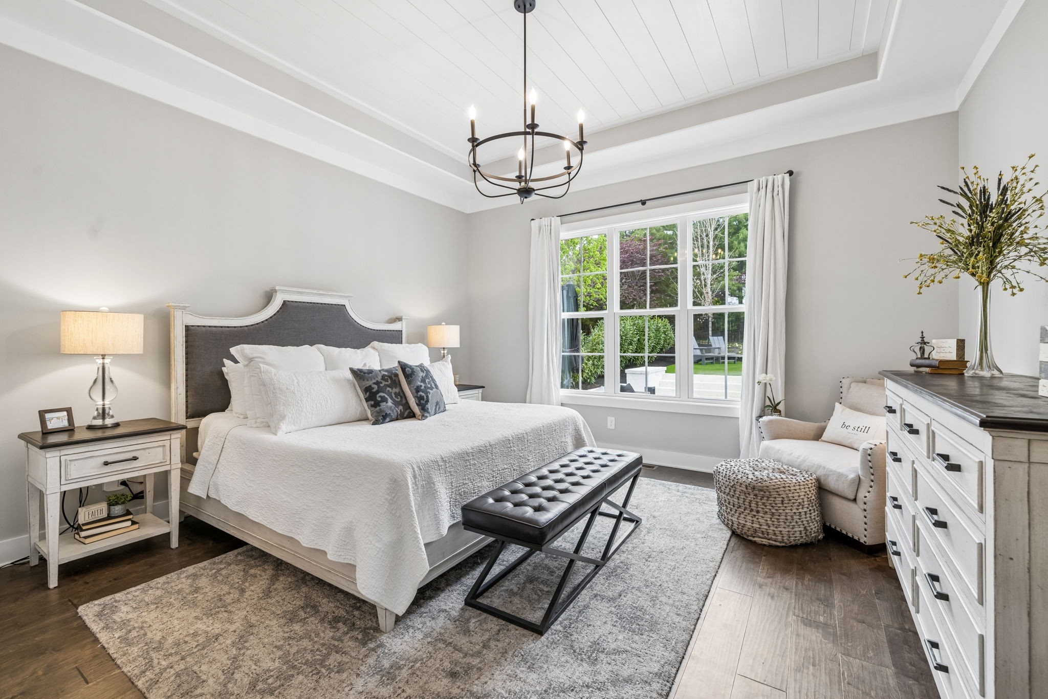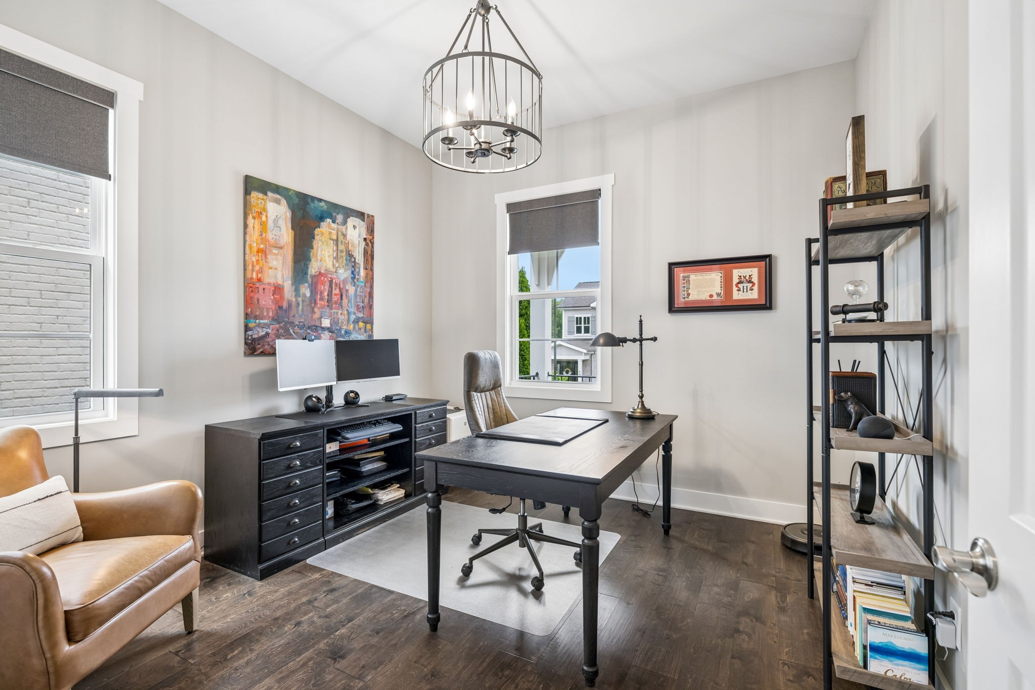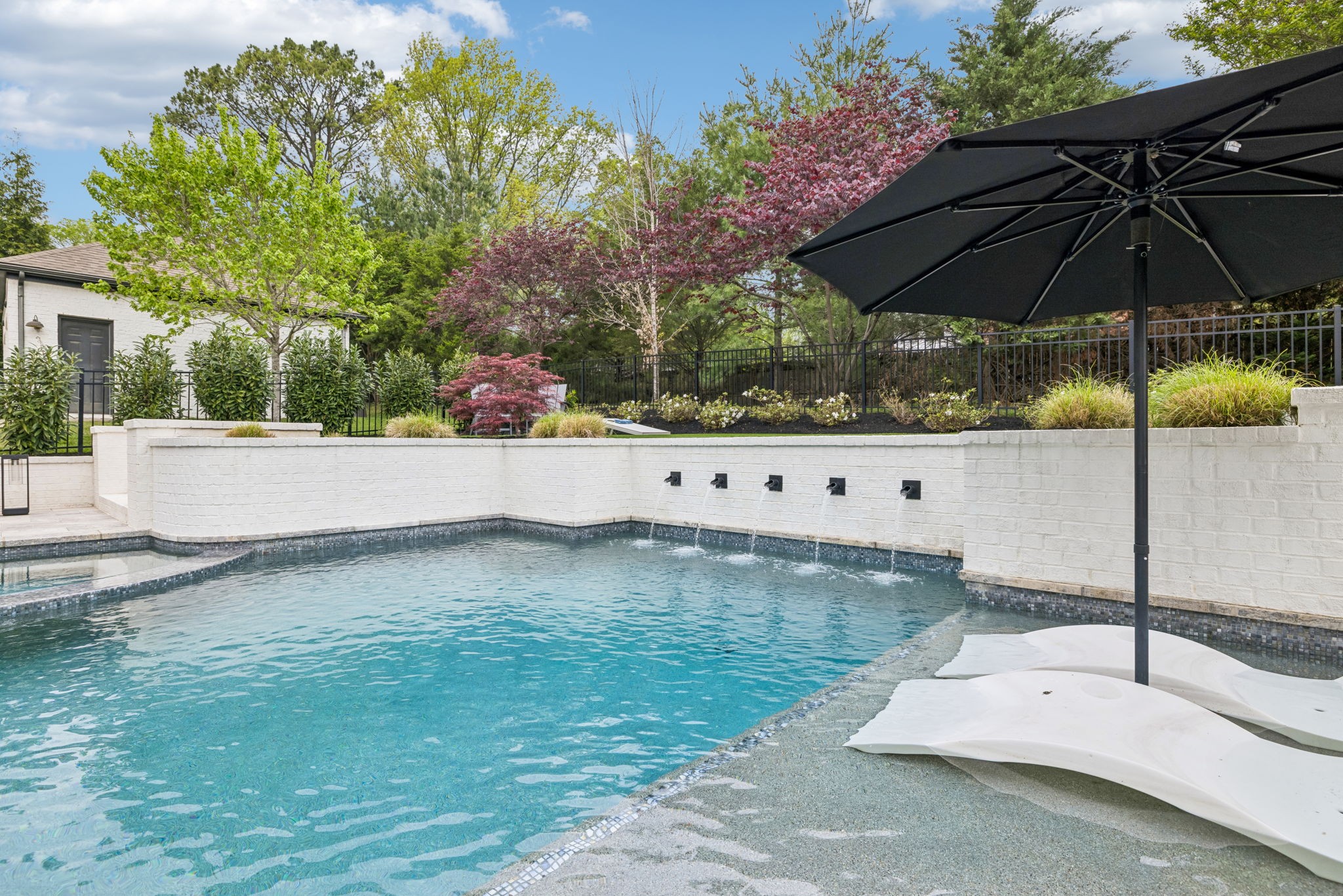 Welcome to 408 Dragonfly Court, a custom-built Hidden Valley Homes residence offering refined living just one mile from historic downtown Franklin and The Factory. Built in 2019, this 4-bedroom, 4-bath home blends thoughtful design, elevated finishes, and exceptional indoor-outdoor living. The main level features both the primary suite and guest suite, along with a functional built-in workspace seamlessly integrated into the laundry room. The chef's kitchen is designed for both everyday living and entertaining, showcasing ceiling-height custom cabinetry, a premium Cafe appliance suite, an oversized island, and a dedicated wine/cocktail area. Throughout the home, you'll find engineered hardwood flooring, upgraded tile, custom trim and shiplap, designer lighting, and Sherwin-Williams Duration paint. All closets are fully customized, and each bathroom features frameless glass shower enclosures for a clean, modern aesthetic. Step outside to a professionally designed backyard retreat featuring a saltwater Gunite pool and spa (2023), sun shelf, fire pit, and multiple gathering spaces. The covered rear porch with retractable screens by Nashville Retractable Screens, built-in gas lines, and integrated audio creates a true year-round outdoor living experience. Additional highlights include a tankless water heater, encapsulated crawlspace, extensive storage, ADT security, and premium audio/visual equipment that remains with the home. A rare opportunity to enjoy luxury, convenience, and lifestyle in one of Franklin's most desirable locations.