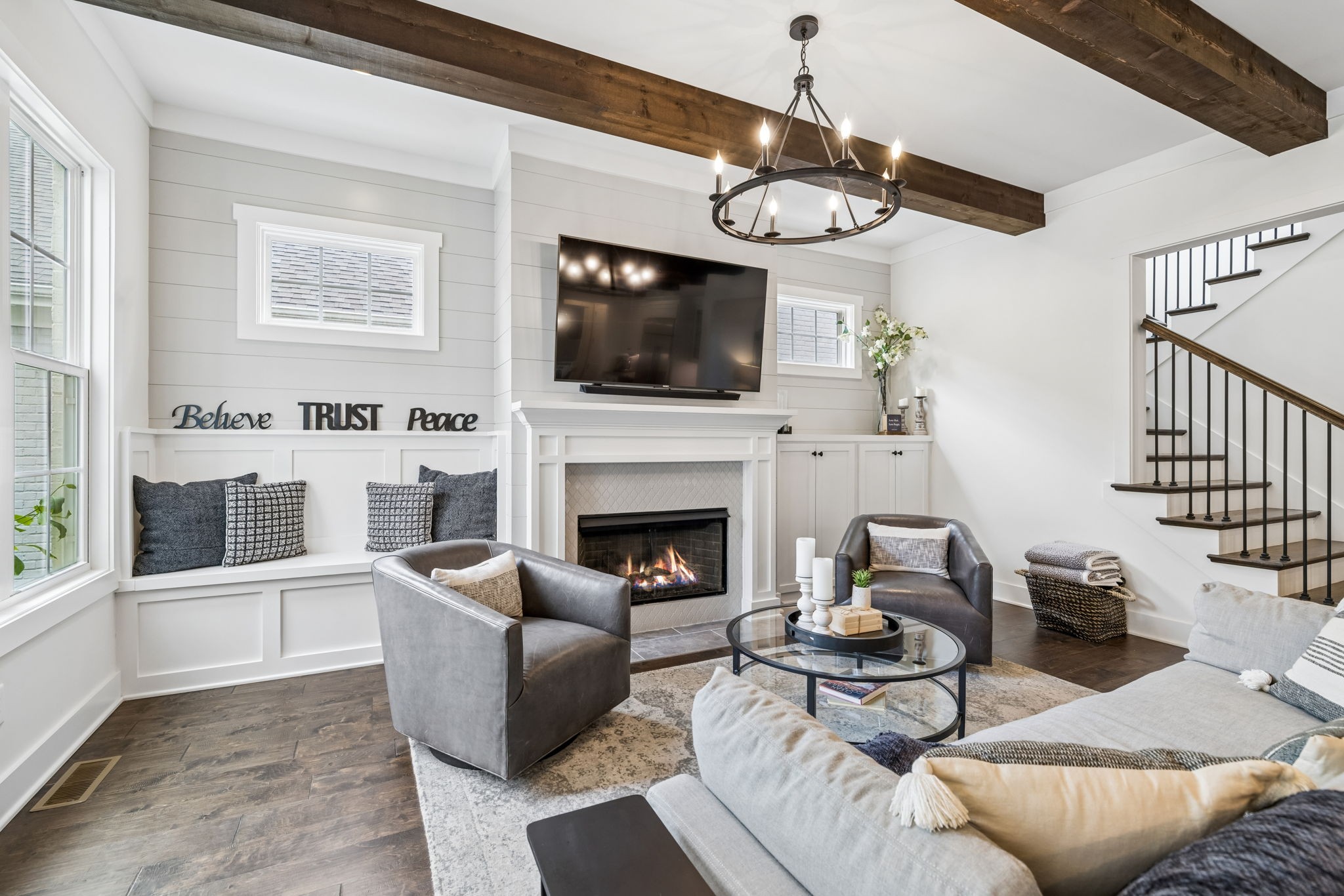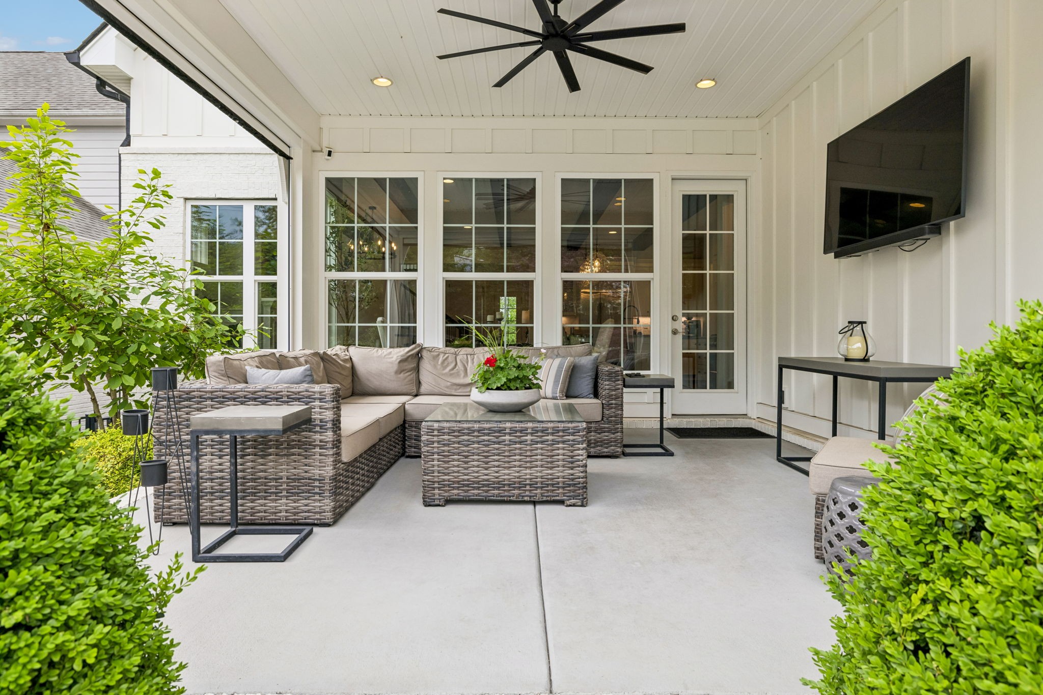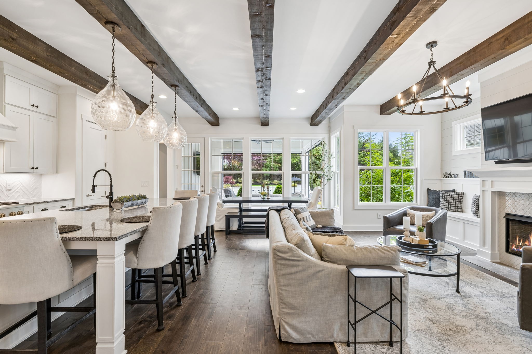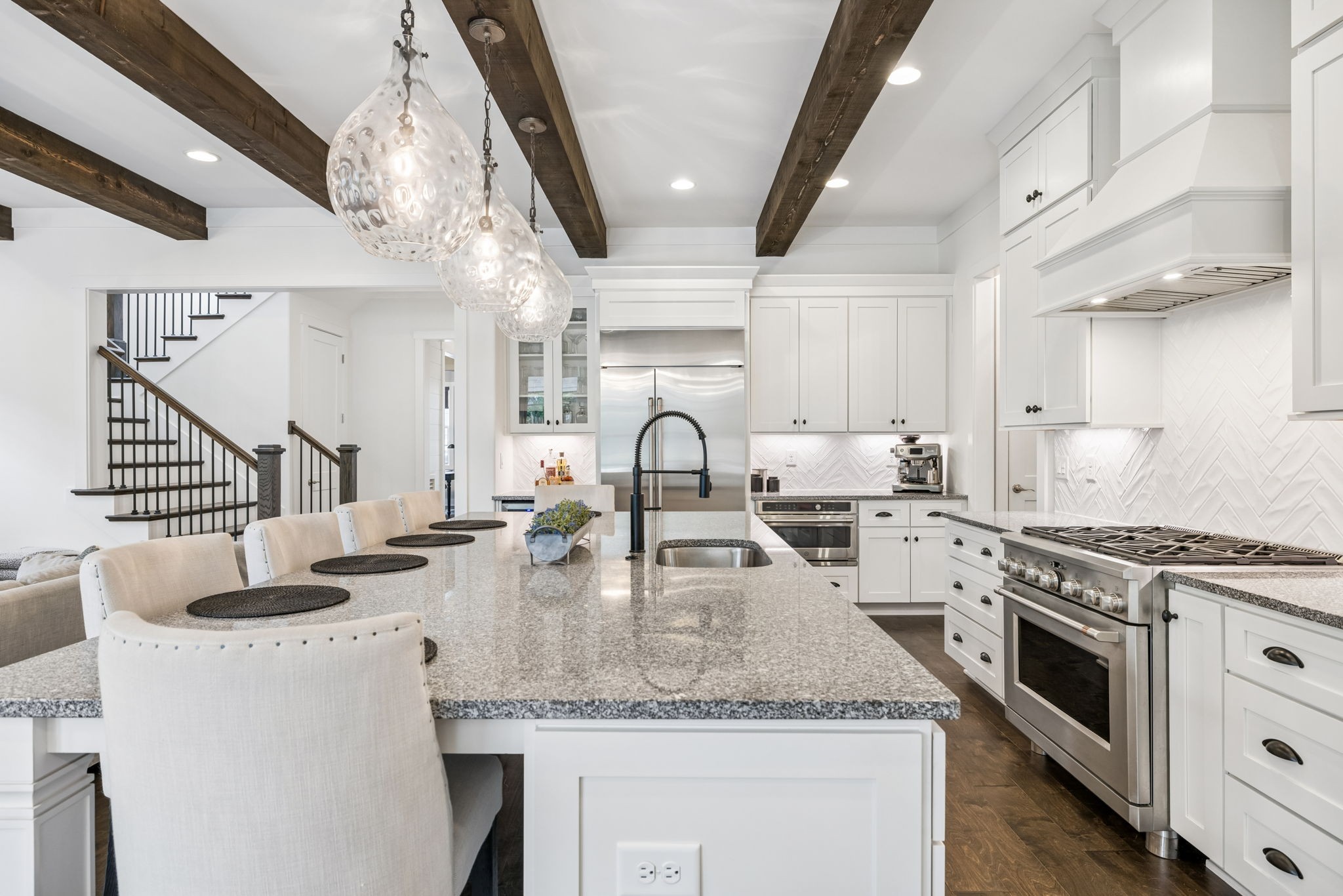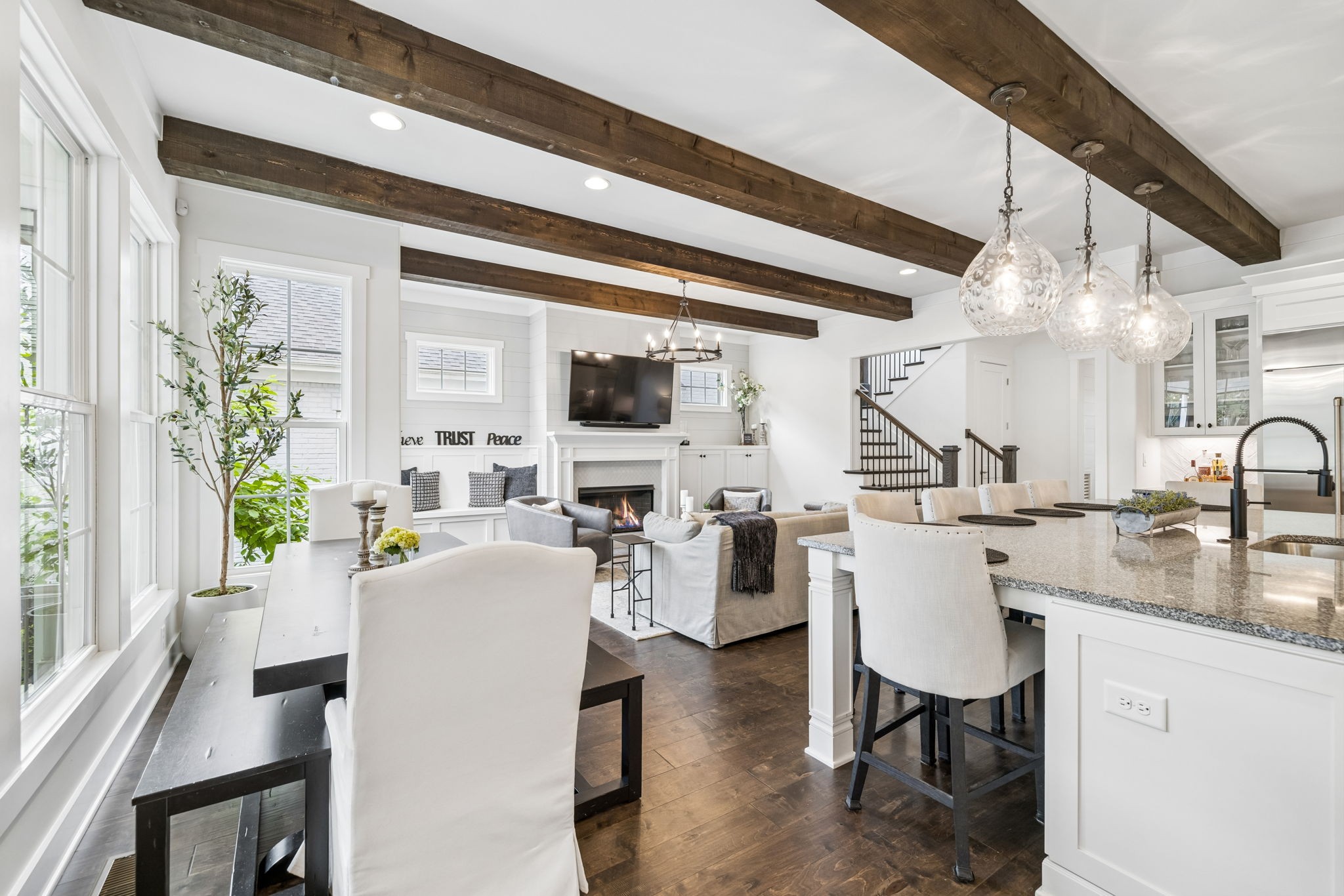 Welcome to 408 Dragonfly Court, a custom-built Hidden Valley Homes residence offering refined living just one mile from historic downtown Franklin and The Factory. Built in 2019, this 4-bedroom, 4-bath home blends thoughtful design, elevated finishes, and exceptional indoor-outdoor living. The main level features both the primary suite and guest suite, along with a functional built-in workspace seamlessly integrated into the laundry room. The chef's kitchen is designed for both everyday living and entertaining, showcasing ceiling-height custom cabinetry, a premium Cafe appliance suite, an oversized island, and a dedicated wine/cocktail area. Throughout the home, you'll find engineered hardwood flooring, upgraded tile, custom trim and shiplap, designer lighting, and Sherwin-Williams Duration paint. All closets are fully customized, and each bathroom features frameless glass shower enclosures for a clean, modern aesthetic. Step outside to a professionally designed backyard retreat featuring a saltwater Gunite pool and spa (2023), sun shelf, fire pit, and multiple gathering spaces. The covered rear porch with retractable screens by Nashville Retractable Screens, built-in gas lines, and integrated audio creates a true year-round outdoor living experience. Additional highlights include a tankless water heater, encapsulated crawlspace, extensive storage, ADT security, and premium audio/visual equipment that remains with the home. A rare opportunity to enjoy luxury, convenience, and lifestyle in one of Franklin's most desirable locations.