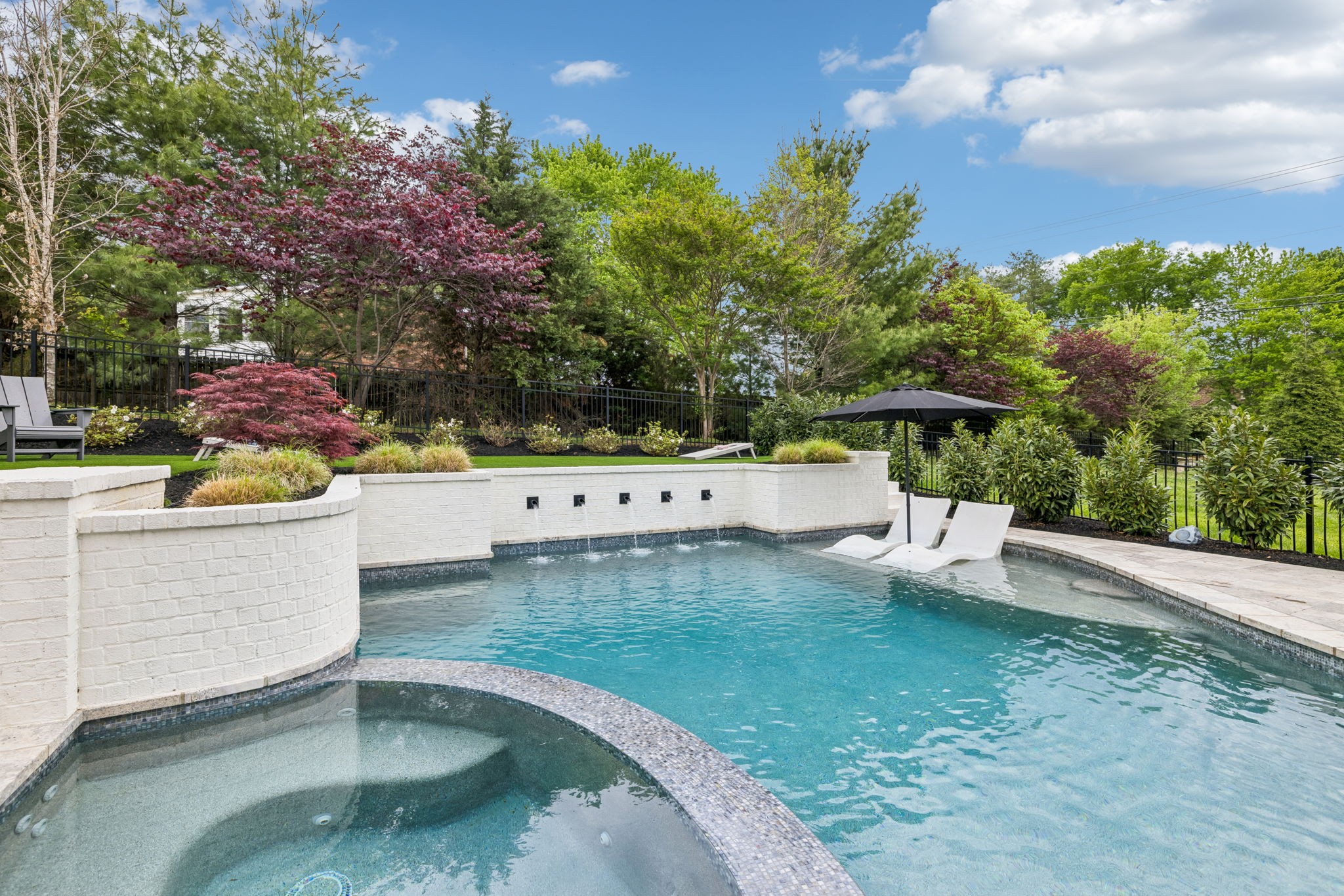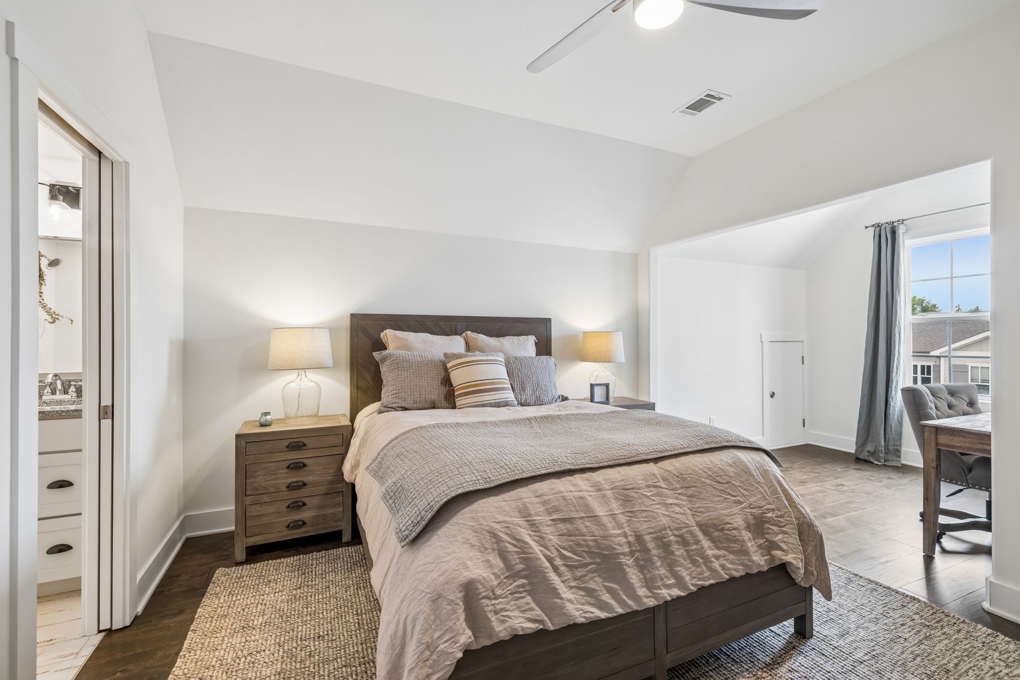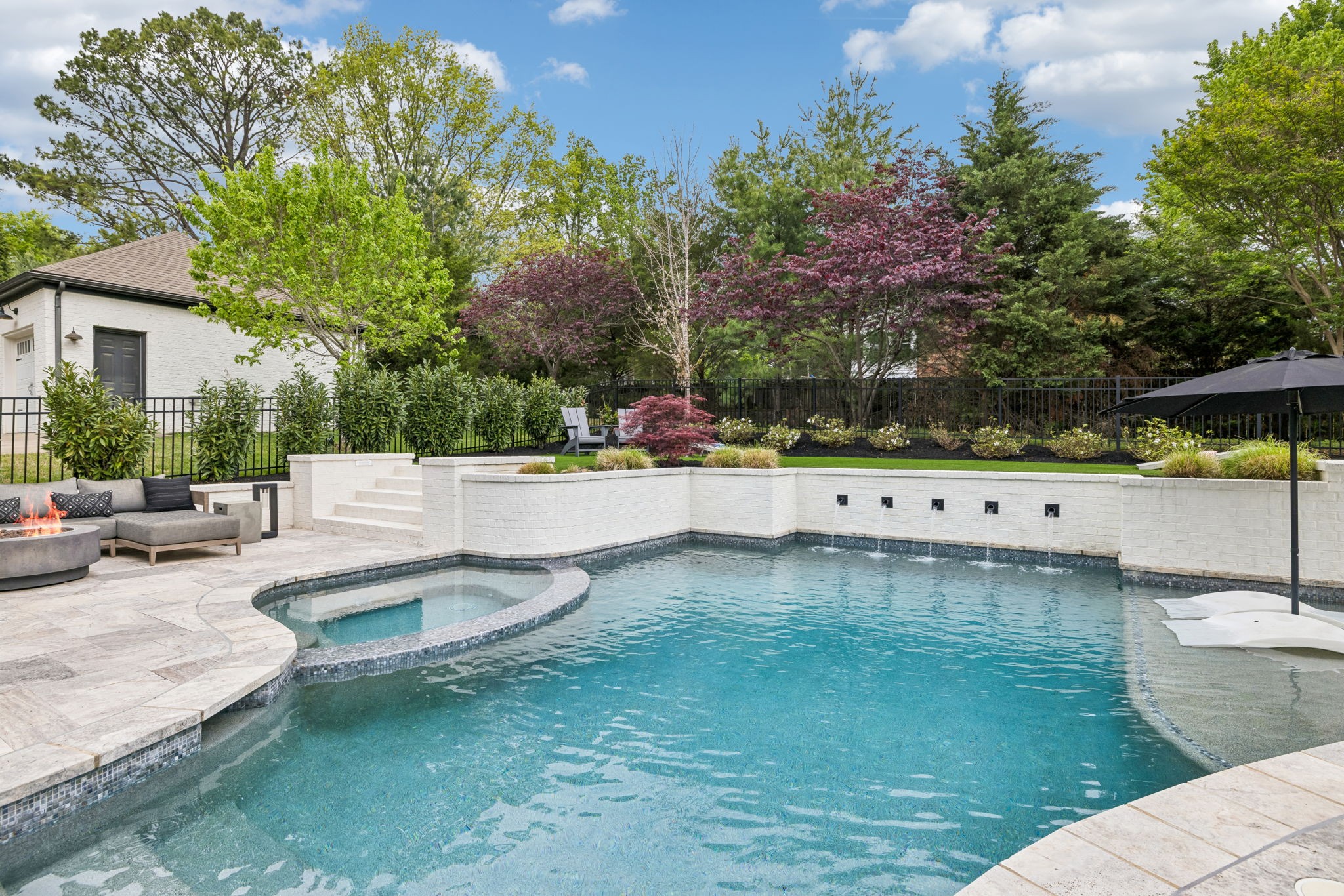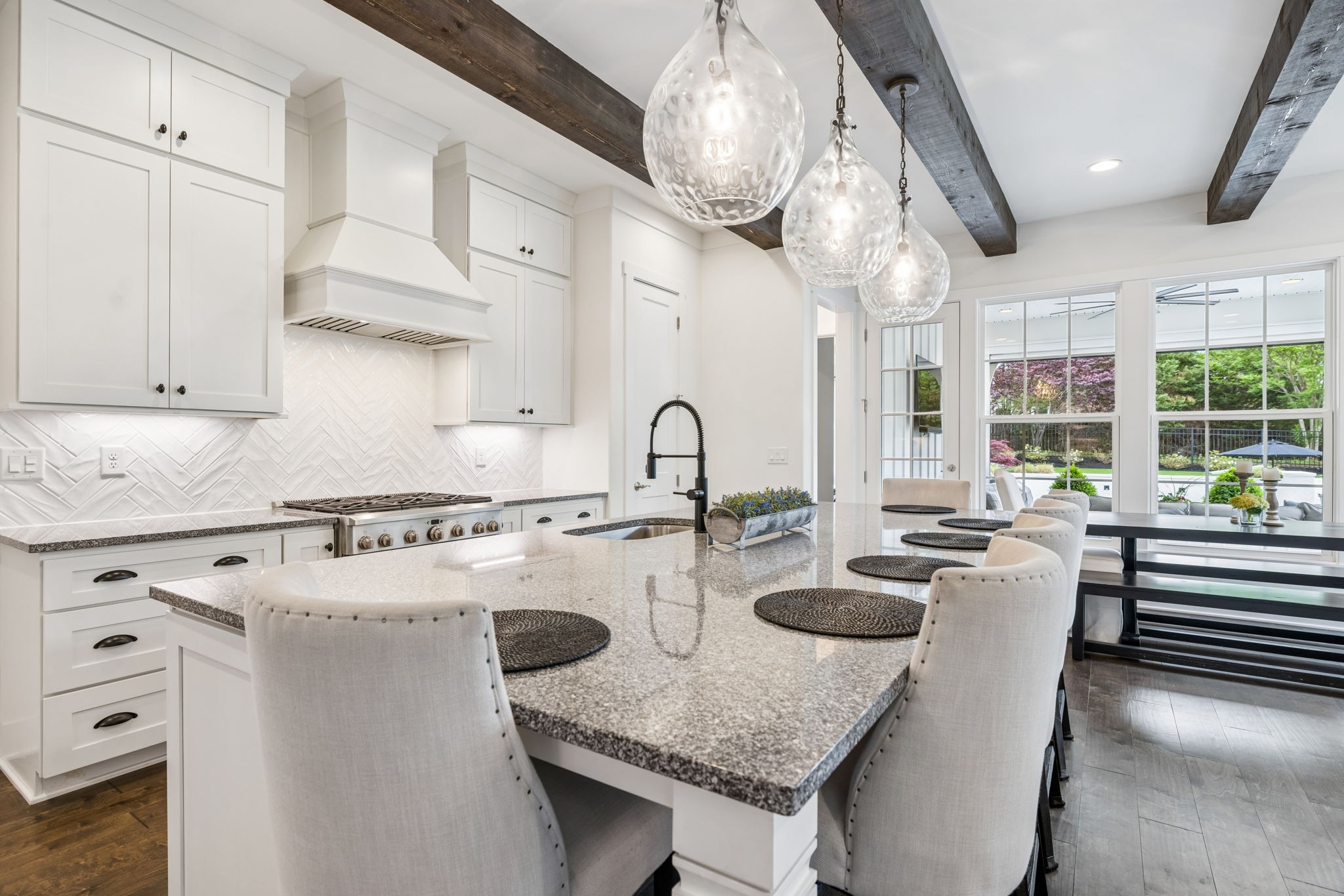 Welcome to 408 Dragonfly Court, a custom-built Hidden Valley Homes residence offering refined living just one mile from historic downtown Franklin and The Factory. Built in 2019, this 4-bedroom, 4-bath home blends thoughtful design, elevated finishes, and exceptional indoor-outdoor living. The main level features both the primary suite and guest suite, along with a functional built-in workspace seamlessly integrated into the laundry room. The chef's kitchen is designed for both everyday living and entertaining, showcasing ceiling-height custom cabinetry, a premium Cafe appliance suite, an oversized island, and a dedicated wine/cocktail area. Throughout the home, you'll find engineered hardwood flooring, upgraded tile, custom trim and shiplap, designer lighting, and Sherwin-Williams Duration paint. All closets are fully customized, and each bathroom features frameless glass shower enclosures for a clean, modern aesthetic. Step outside to a professionally designed backyard retreat featuring a saltwater Gunite pool and spa (2023), sun shelf, fire pit, and multiple gathering spaces. The covered rear porch with retractable screens by Nashville Retractable Screens, built-in gas lines, and integrated audio creates a true year-round outdoor living experience. Additional highlights include a tankless water heater, encapsulated crawlspace, extensive storage, ADT security, and premium audio/visual equipment that remains with the home. A rare opportunity to enjoy luxury, convenience, and lifestyle in one of Franklin's most desirable locations.