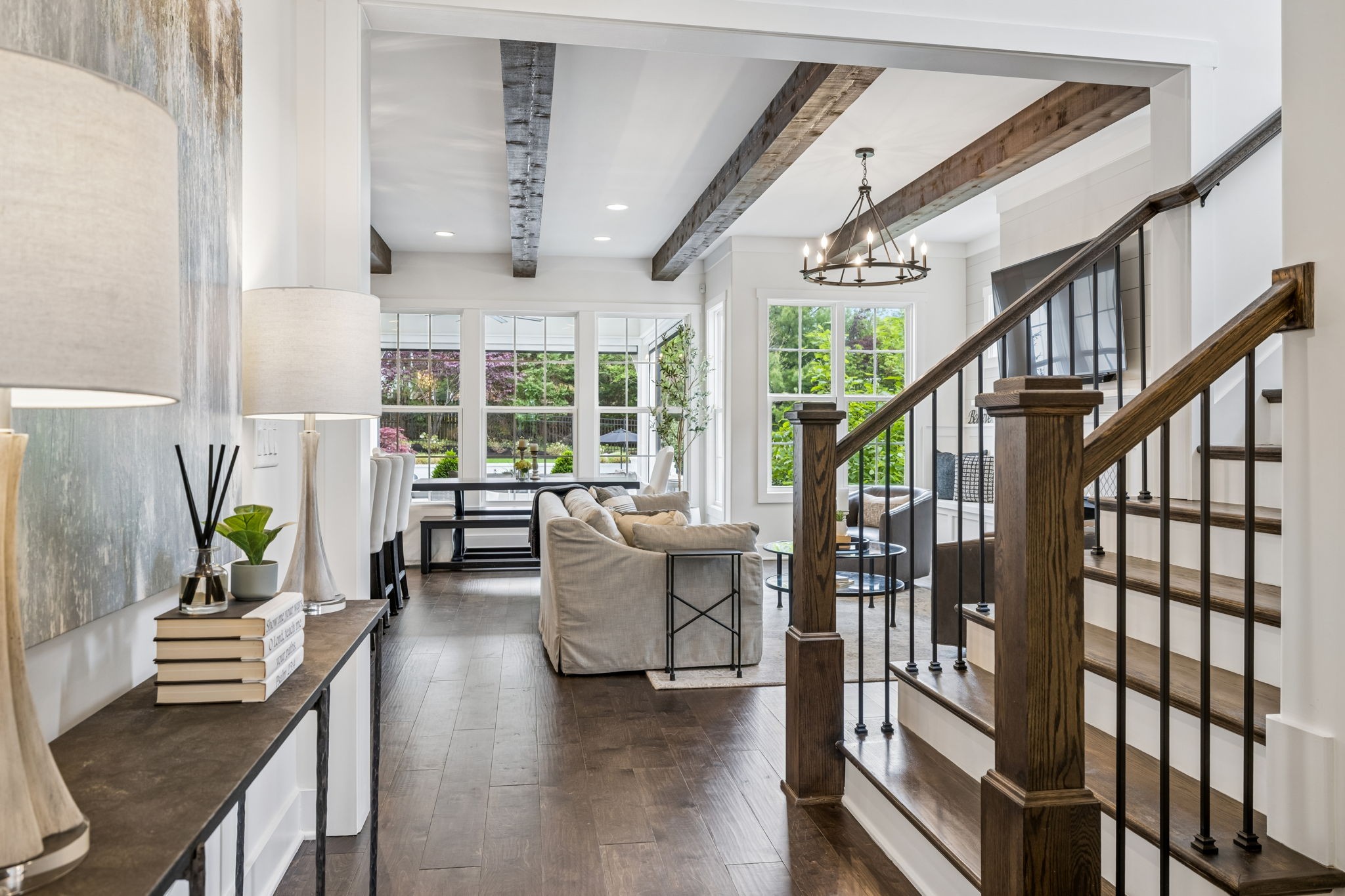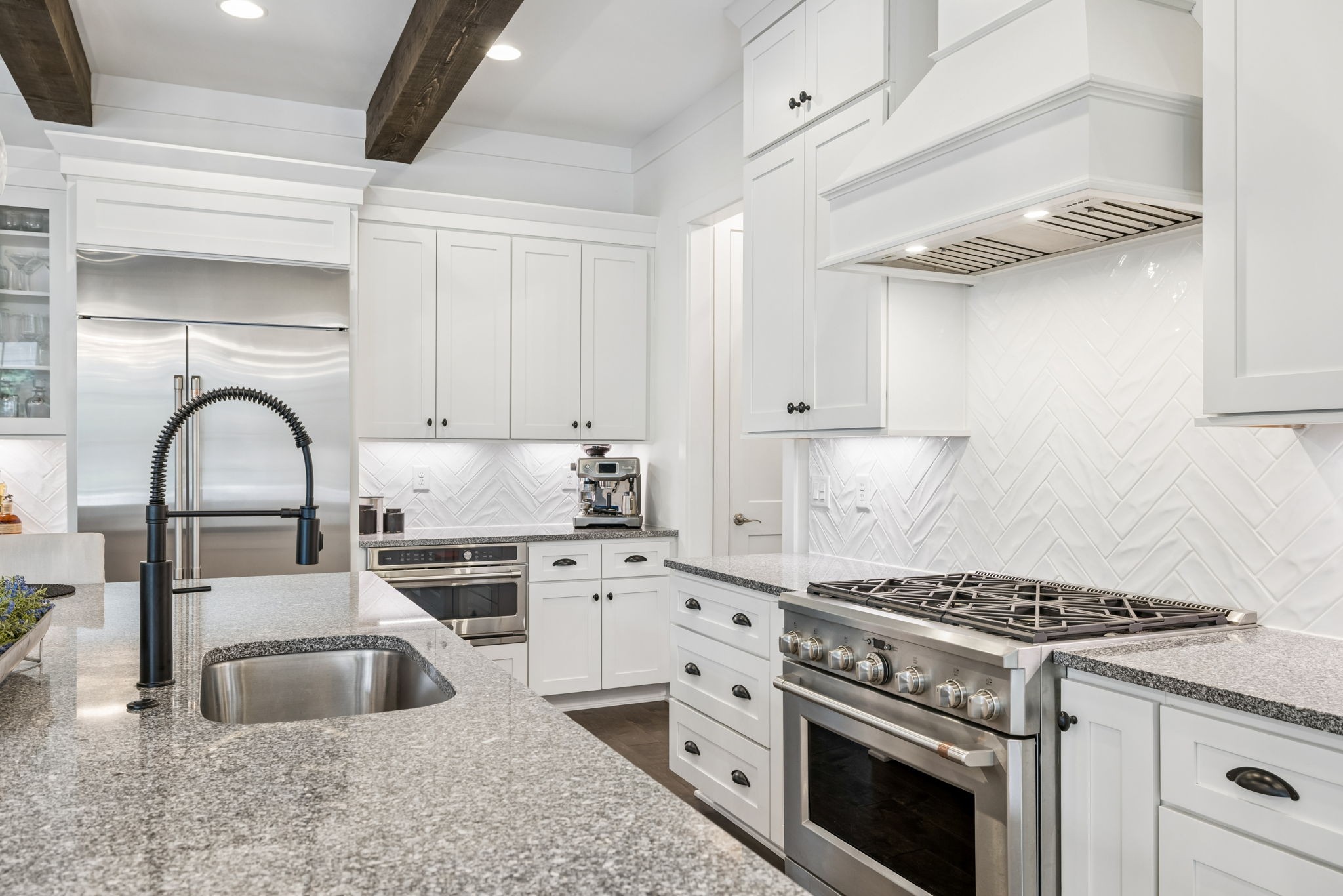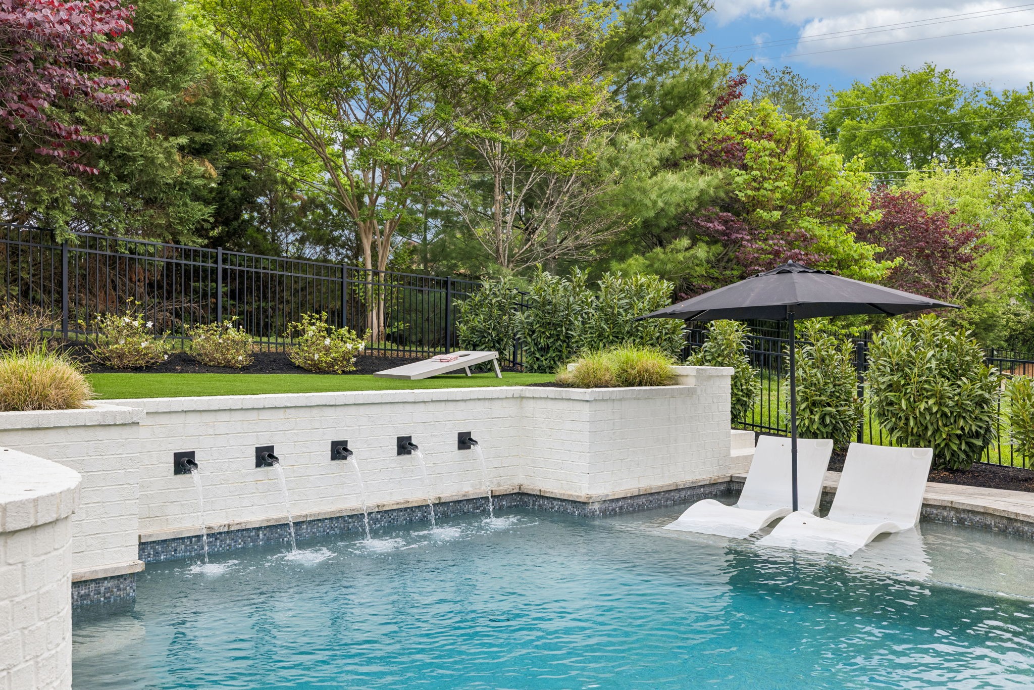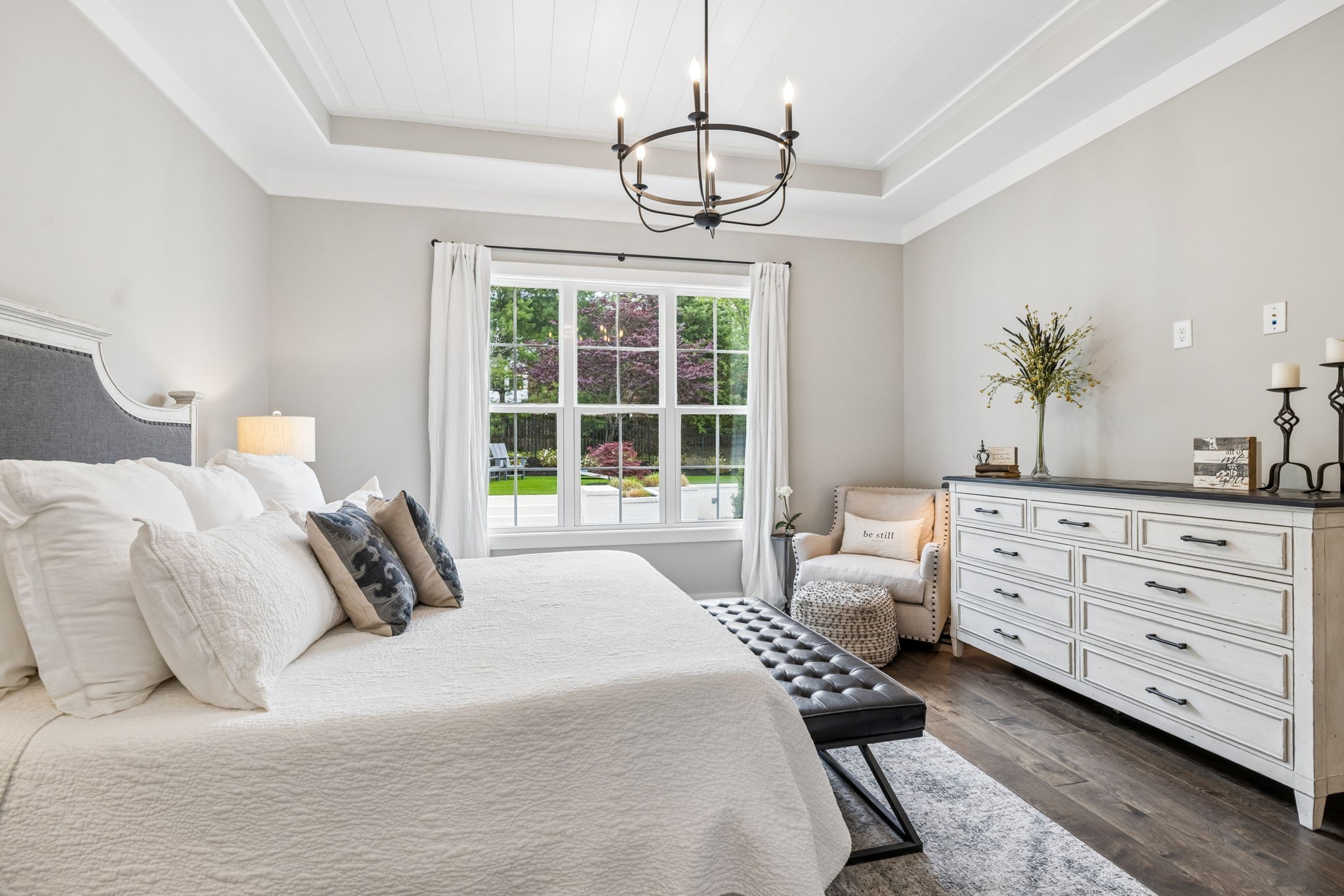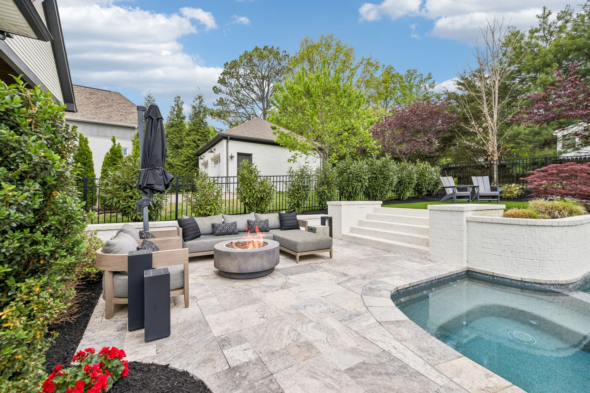 Welcome to 408 Dragonfly Court, a custom-built Hidden Valley Homes residence offering refined living just one mile from historic downtown Franklin and The Factory. Built in 2019, this 4-bedroom, 4-bath home blends thoughtful design, elevated finishes, and exceptional indoor-outdoor living. The main level features both the primary suite and guest suite, along with a functional built-in workspace seamlessly integrated into the laundry room. The chef's kitchen is designed for both everyday living and entertaining, showcasing ceiling-height custom cabinetry, a premium Cafe appliance suite, an oversized island, and a dedicated wine/cocktail area. Throughout the home, you'll find engineered hardwood flooring, upgraded tile, custom trim and shiplap, designer lighting, and Sherwin-Williams Duration paint. All closets are fully customized, and each bathroom features frameless glass shower enclosures for a clean, modern aesthetic. Step outside to a professionally designed backyard retreat featuring a saltwater Gunite pool and spa (2023), sun shelf, fire pit, and multiple gathering spaces. The covered rear porch with retractable screens by Nashville Retractable Screens, built-in gas lines, and integrated audio creates a true year-round outdoor living experience. Additional highlights include a tankless water heater, encapsulated crawlspace, extensive storage, ADT security, and premium audio/visual equipment that remains with the home. A rare opportunity to enjoy luxury, convenience, and lifestyle in one of Franklin's most desirable locations.